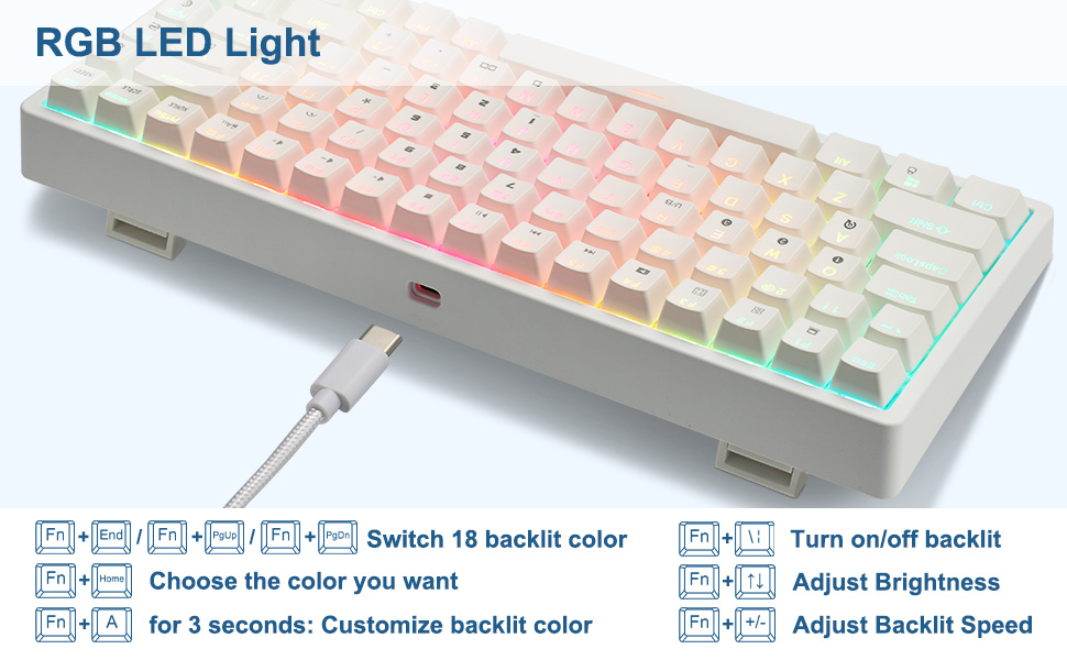 ❤ PROGRAMABLE FULL RGB BACKLIGHTING: You can program all of the keys to be the same color/what color you want with no driver needed. Preset 18-mode RGB Backlighting and Color-Flashing Speed. Double-shot injection molded keycaps for crystal clear backlighting