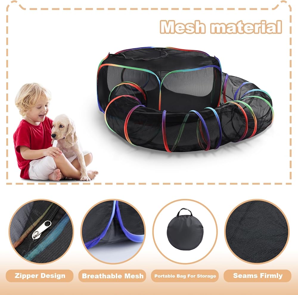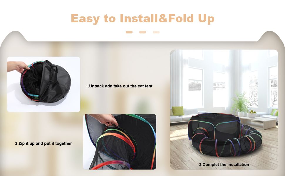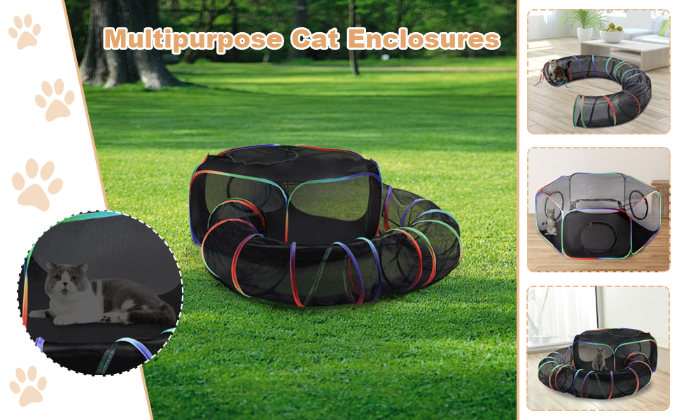 【Outdoor Indoor Cat Enclosures】The portable cat playpen is designed with a big cat tent and a surround tunnel, which linked by zipper, you can link them together or separately use, you can put toys, treats, litter box in it.