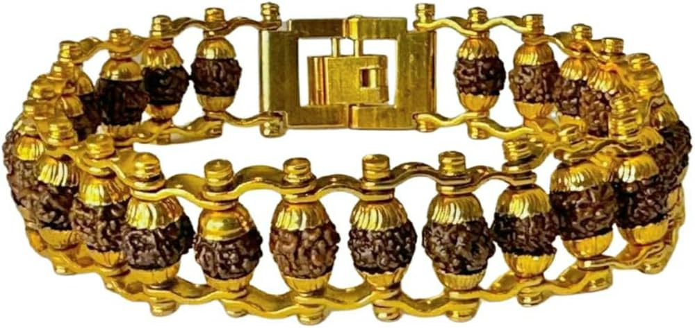 This is hande made Rudraksha bead bracelet with yellow color stainless steel link. It is traditionally believed that they can destroy negative thought and grant the wearer peace of mind, clarity, and purpose. The bead of the Rudraksha tree (Elaeocarpus granitrus) holds a very special place in Hinduism, and is credited to possess mystical and divine properties. According to the Ayurvedic medical system, wearing Rudraksha can have a positive effect on the heart and nerves, and relieve you from stress, anxiety, depression, palpitations and lack of concentration. It is also known for its anti ageing effect, and electromagnetic and inductive properties. People with high blood pressure have been found have benefited from the use of Rudraksha seeds.