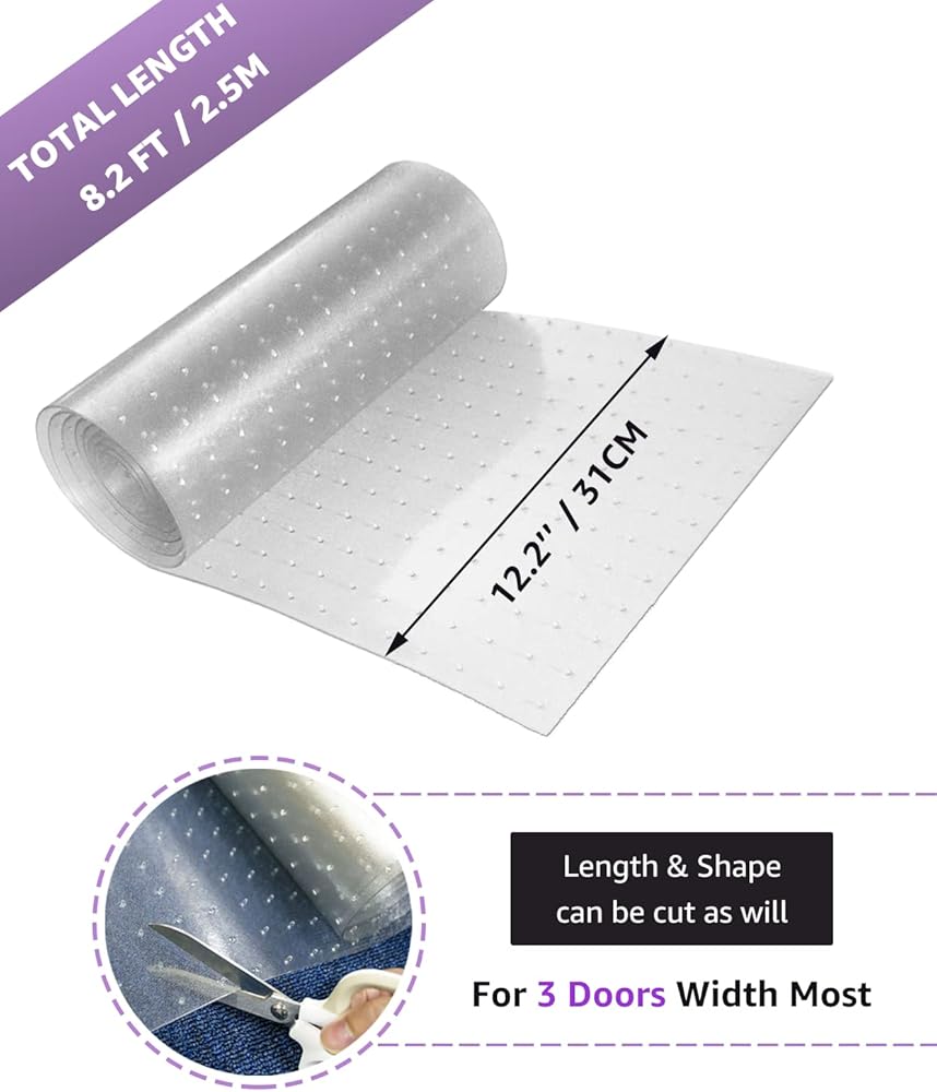 No Slip & DIY Sizes Avaliable: 8.2 feet long can be cut as will to meet from 29 1/2"-29 15/16" doorway to 33 1/2" - 33 15/16" doorway width with anti-slid spikes that stays put even with persistent diggers, giving your carpet form-fitted claw-proof protection