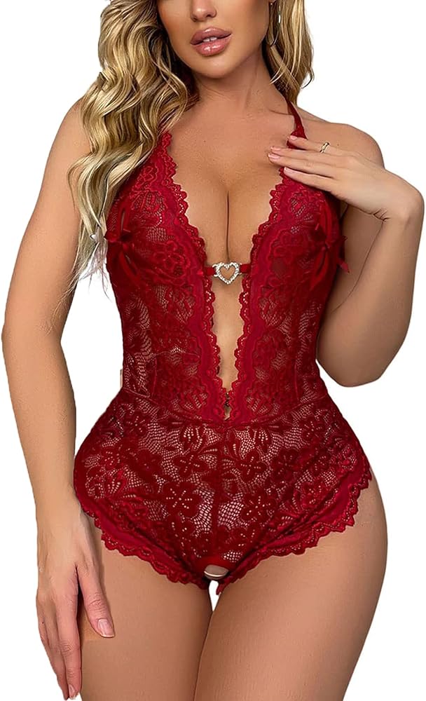 Women's Sexy Lingerie One Piece Women Deep V Teddy Floral Lace Bodysuit Babydoll(M, Bow Ties Red)