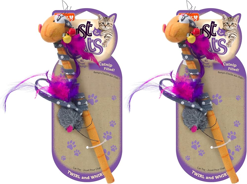 With the flick of your wrist, the Hartz Just For Cats Twirl & Whirl Wand becomes an irresistible target for curious kitties. Designed to encourage playtime and bonding, this wand keeps cats agile and alert, while letting pet parents get in on the fun! It features a variety of textures with feathers, bells and colorful designs to capture your cat's attention. It even has a catnip-filled toy to keep your companion coming back for more pawsome action. Simply dangle the attached plush, and even the most inactive cat will be up on all paws ready to swat and stalk.