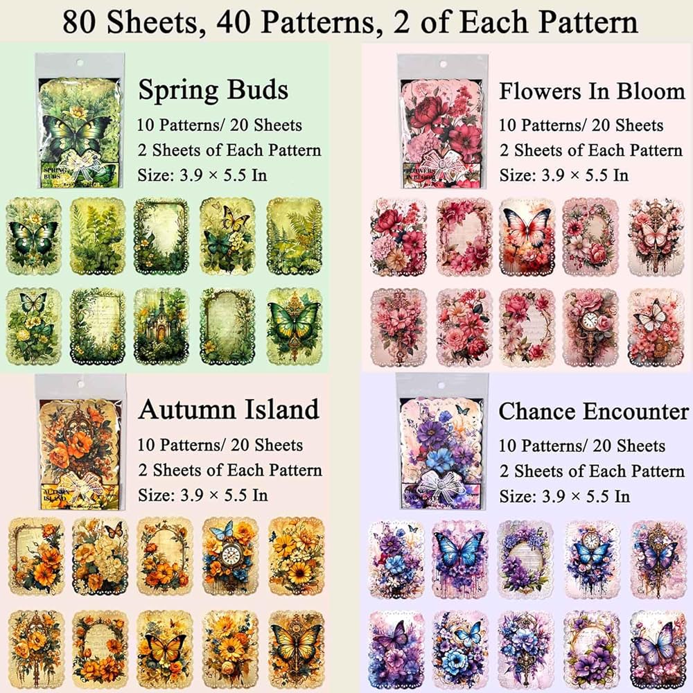 Quantity - Our lace shaped scrapbook papers feature a vast array of 80 sheets across 40 unique patterns, each with two identical sheets to maximize your creative potential. Dive into our meticulously designed thematic designs: 'Spring Buds' as green scrapbook paper, 'Flowers In Bloom' as red, 'Autumn Island' as yellow, and 'Chance Encounter' as purple scrapbook paper.