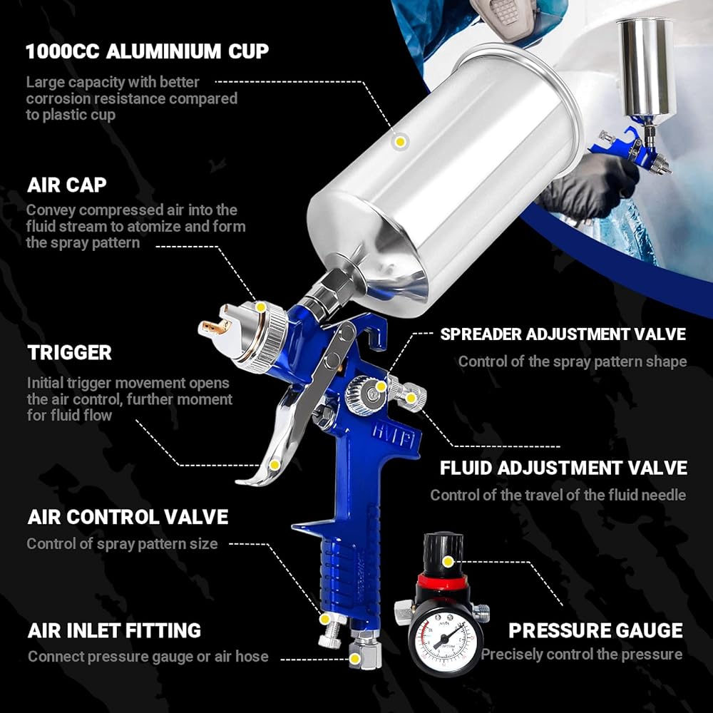 HVLP Spray Gun Kit with 1.4mm/ 1.7mm/ 2.0mm Nozzles High Performance Paint Gun Large Capacity 1000cc Aluminum Cup with Pressure Gauge for Auto Paint, Base-Coats, Clear-Coats and Primer-Blue