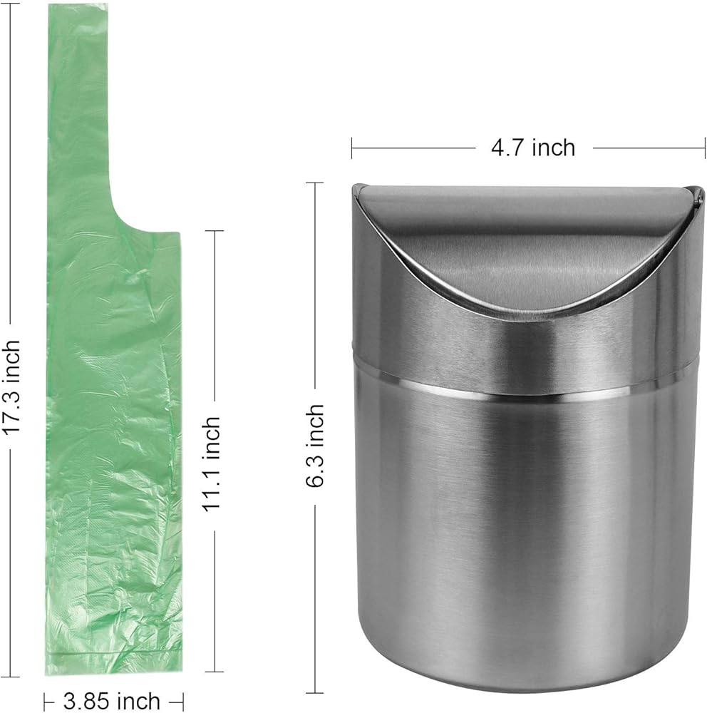 Material: The trash can is made of 100% Brushed Steel, matte stainless steel which is fingerprint resistant and stain proof, super solid construction, smooth for easy clean. The trash bag is made of food grade plastic