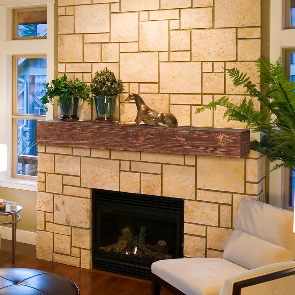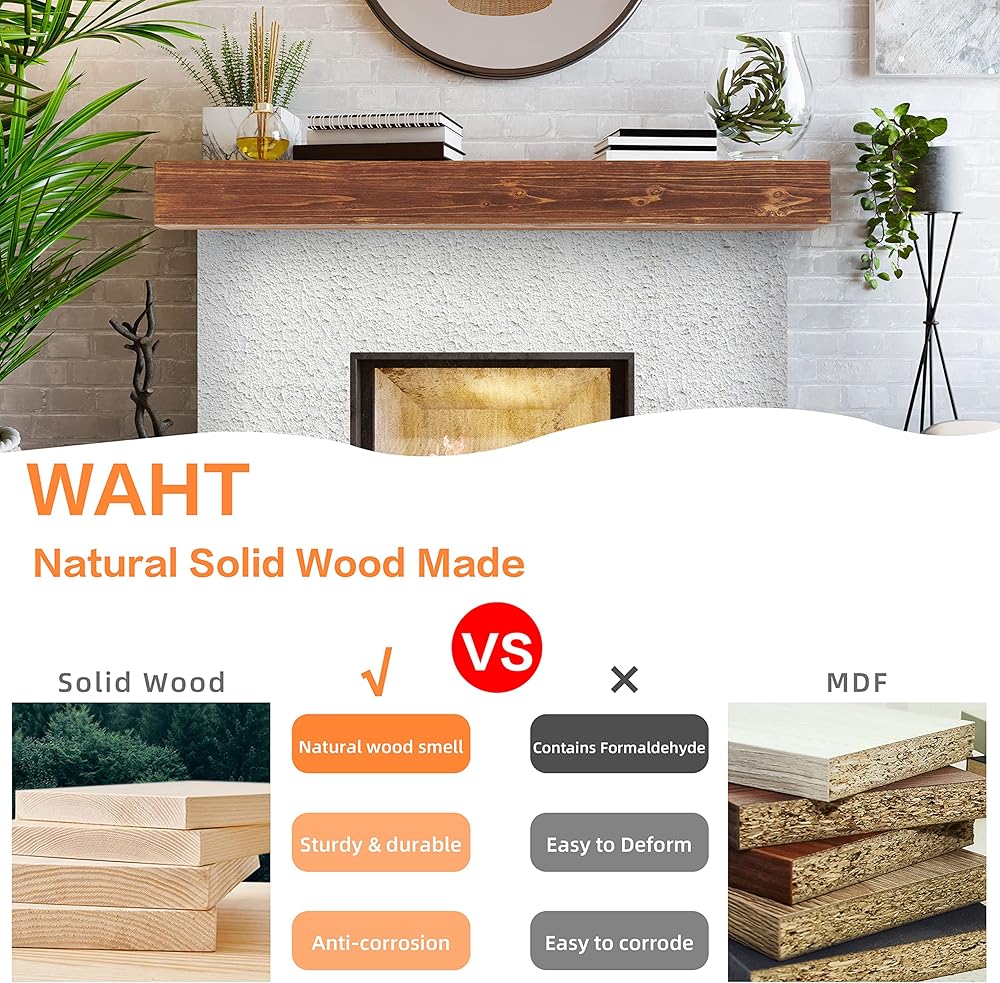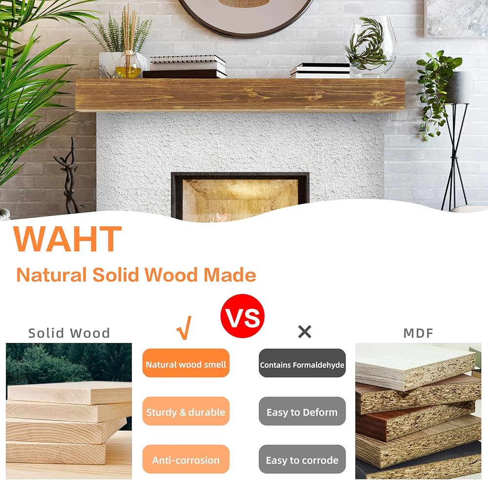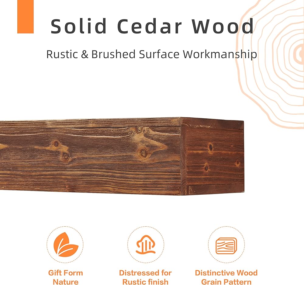 [RUSTIC WOOD MATERIAL]: Wood Fireplace Mantel is made of solid rustic cedar wood; Brushed surface finish with water-based coating; add a rustic touch to living rooms or kitchens