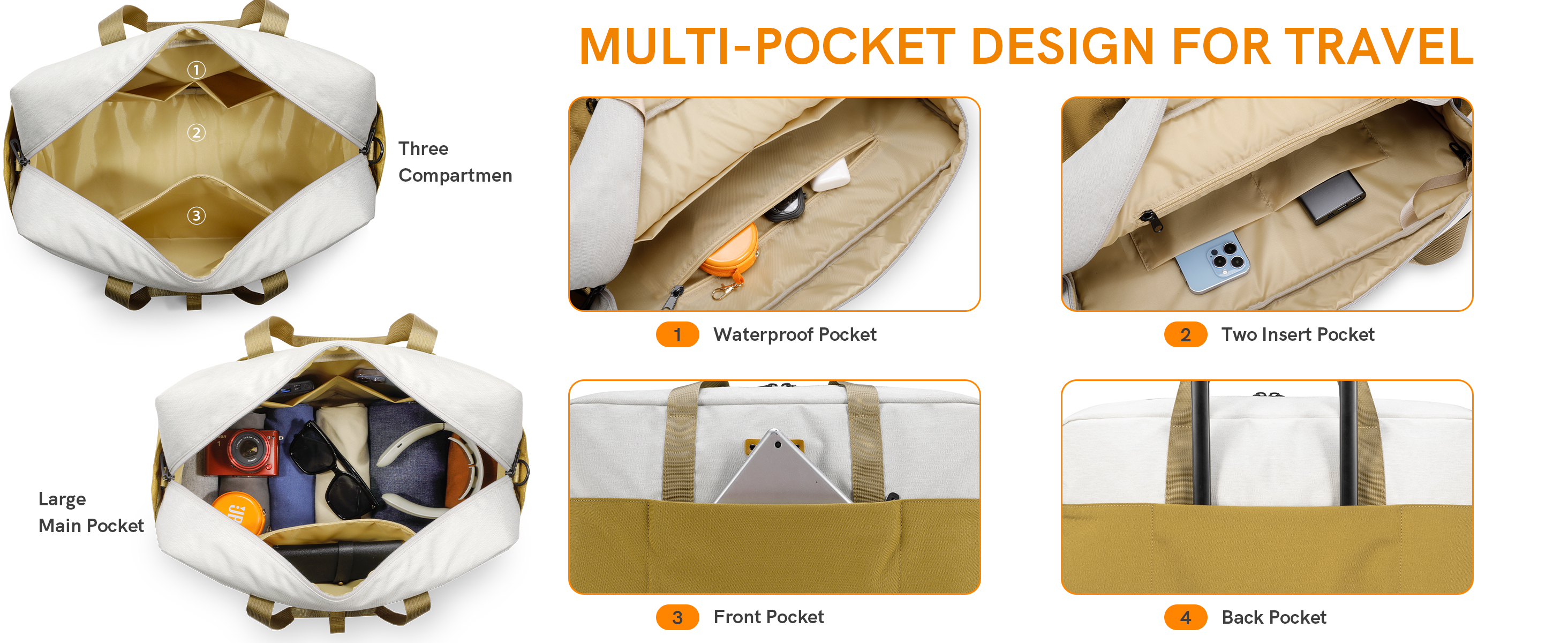 LARGE DUFFLE BAG - 24L Large enough to carry all of you travel essentials for overnight trip. The main pocket can hold your items,fit 5-8pcs clothes, side pocket can hold umbrellas or water bottles,the back pocket on the trolley belt to quick access the items