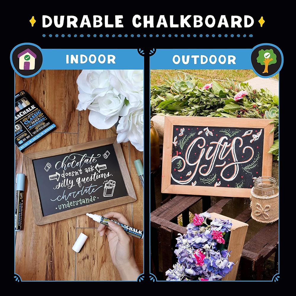 SIZED TO FIT SMALL SPACES – This small, cute, framed chalkboard sign fits on a table top or wall, but is spacious enough to easily hand decorate without feeling cramped. Ideal for a chalkboard menu, wedding party decor, bar hanging chalkboard sign, or kitchen sign.