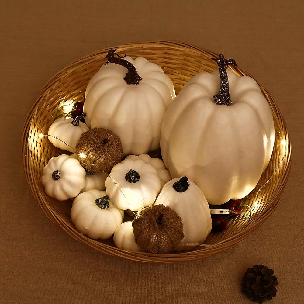 Assorted Size Fake Pumpkins for Decorating: 10 PCS white artificial pumpkins and 2 PCS burlap pumpkins. (Come with a gift box) The size of the large white pumpkin is 7.08 x 5.5in