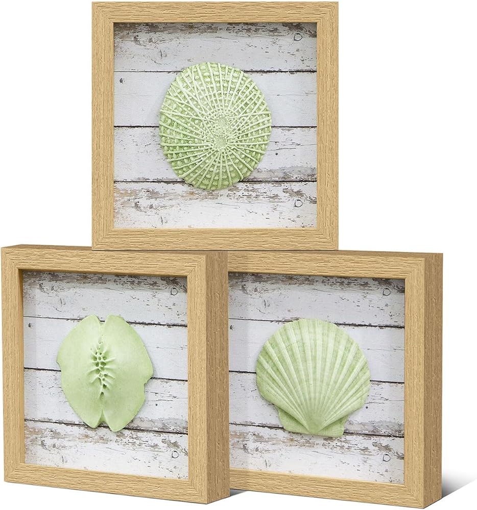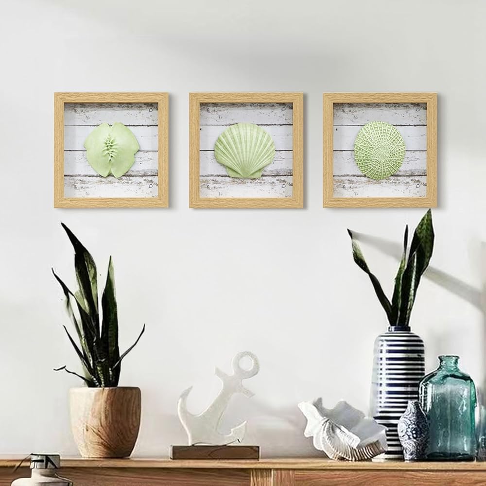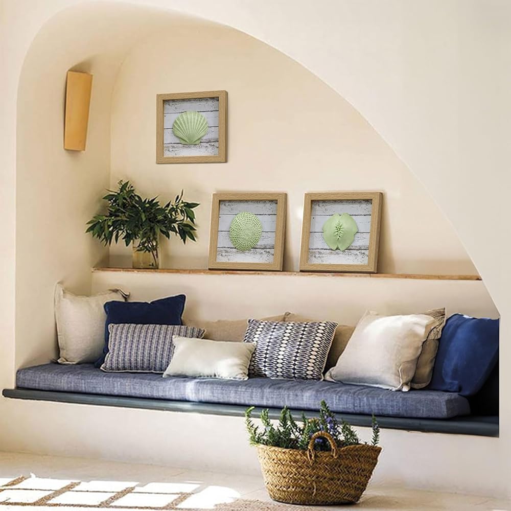 Framed and Ready to Hanging - Each shell in this ocean bathroom decor has an 7.8” x 7.8”wooden frame and the sawtooth hanger is attached at the back, come with non-trace nails, making them easy to hang in any room.