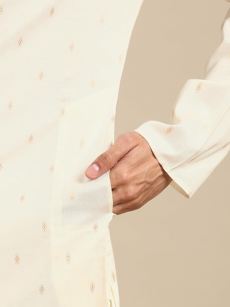 Cream Print Pure Cotton straight kurta, has a mandarin collar, button closures, two pockets, long sleeves, straight hem, and side slits With Pyjama