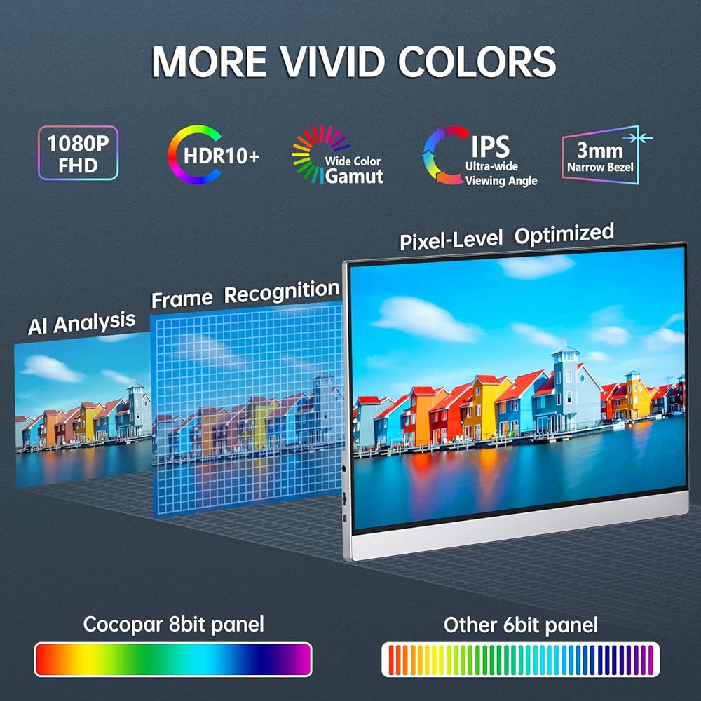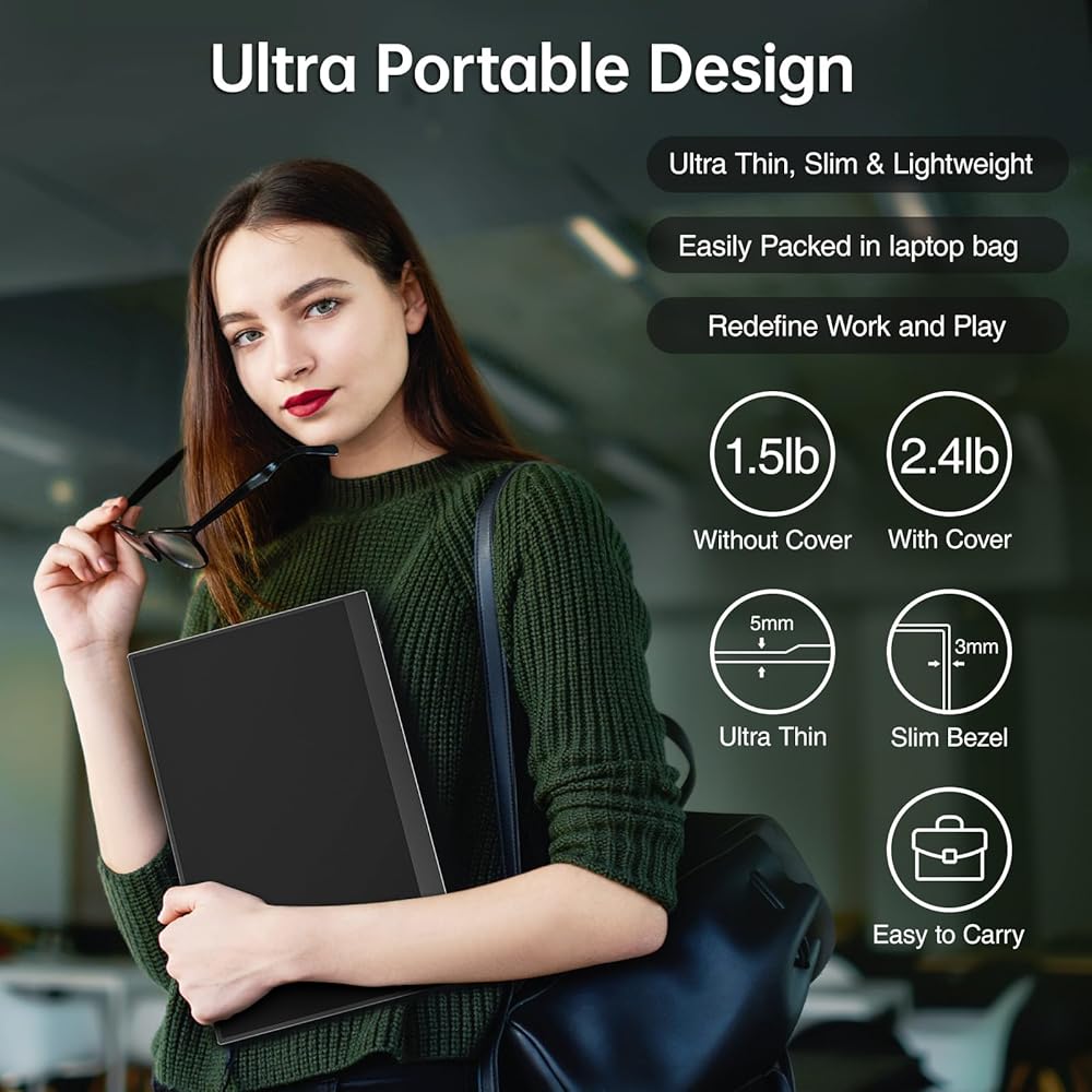 【1080P HDR Monitor】15.6 inch 1920x1080 Super Clear IPS A-grade screen. 1080p resolution, 178° FULL viewing angle, wide color gamut, FreeSync, HDR, Low Blue Light features. Born to deliver you stunning visuals with awesome color reproduction.