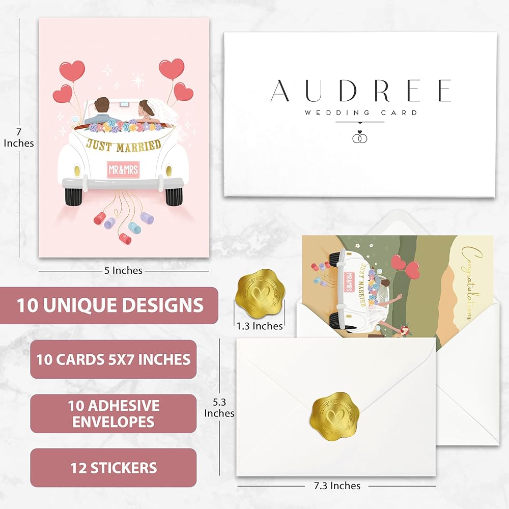 AUDREE 10 Modern Gold Foil Wedding Cards for Bride and Groom with Envelopes (5"x7") - Assorted Greeting Cards For Bridal Shower, Engagement, Newlywed, Wedding Congratulations