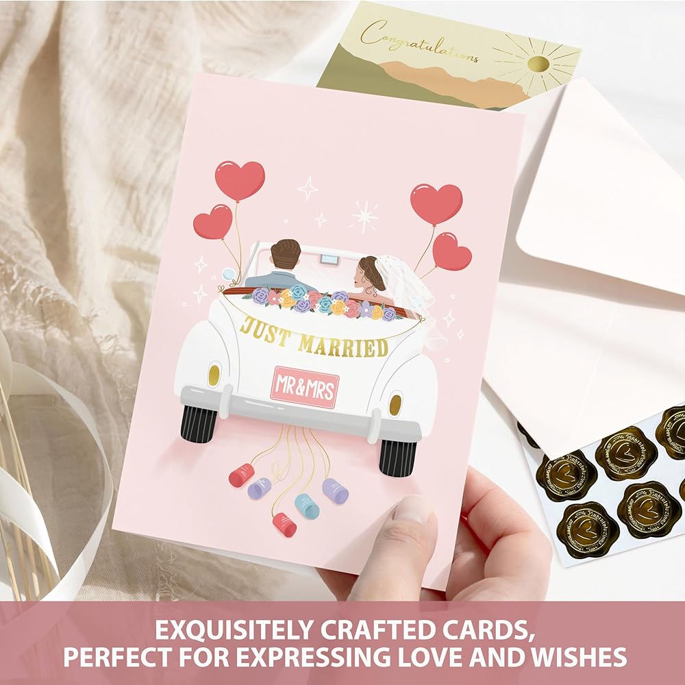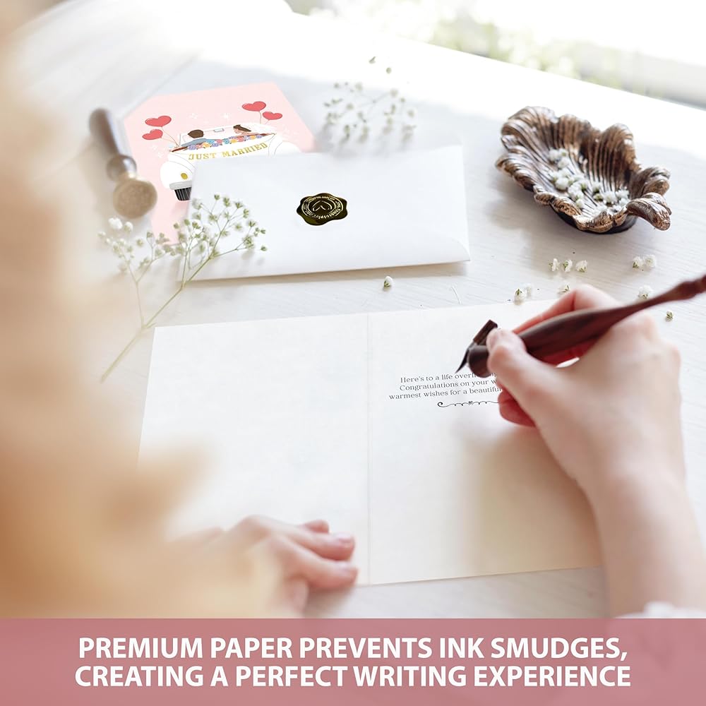 • Wedding greeting card: Crafted on thick, opulent paper, each card stands as a testament to the enduring nature of love. Resistant to the passage of time, these cards are a tangible keepsake of your warm wishes, a reminder of the joy and support that surrounds the couple as they embark on their journey together.