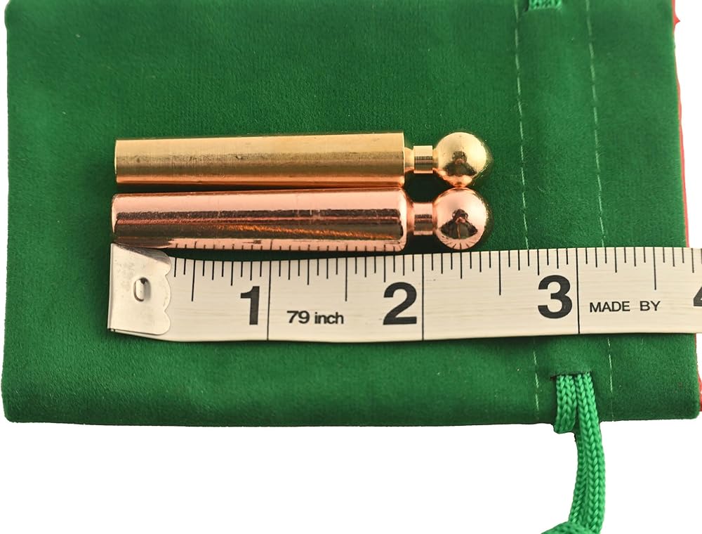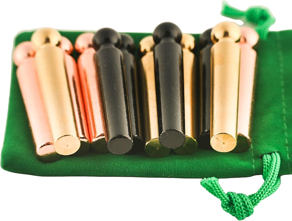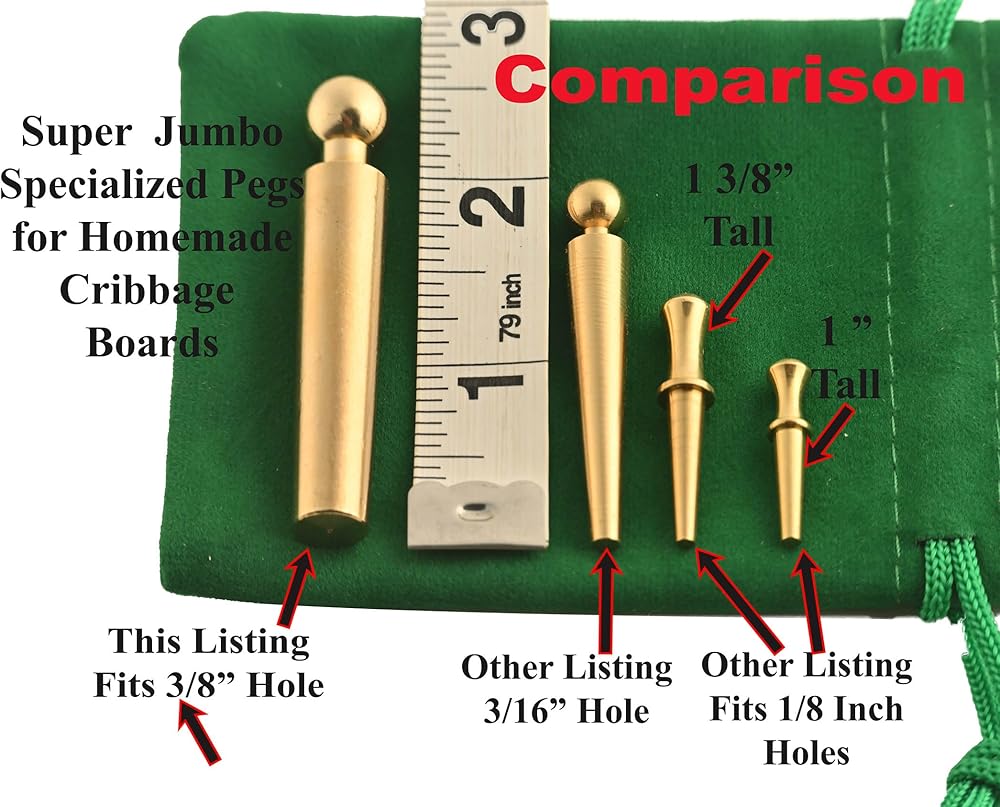 Beautiful set of deluxe metal cribbage pegs to jazz up your cribbage game board. This is a set of 12 super extra jumbo metal pegs. There are 4 Black, 4 Brass, and 4 Copper pegs. Black, Copper are steel plated. They are more resistant to tarnishing. These are oversized, JUMBO pegs. Designed for large and home made cribbage boards. They are 2.5 inches tall and have a tapered design. Fit 3/8 inch holes (which is a lot bigger than the normal 1/8 holes found on most cribbage boards.) At their widest (near the smooth Ball top head of the peg) the diameter is .44 inches (1.11 cm). Best for cribbage boards where the holes are spaced 3/8 inch or more apart from the next hole. Excellent pegs for the crafts/woodworker person planning/designing their own cribbage boards. These pegs will NOT work on average size cribbage boards. Kindly measure the size of the holes in your cribbage board before purchase. Save yourself the time, cost and effort of unnecessary returns. Utilize a 3/8 inch standard wood drill bit to test the size of holes on your cribbage board. Perfect accompaniment for Three Track (3 Lane) Cribbage Boards. Replacement for lost pegs. Will not break like plastic pegs. Includes green velveteen, red satin-lined drawstring storage pouch. Pouch measures approximately 3.5 x 4.5 inches laying flat. Perfect for holding cribbage pegs. Bundled Items.
