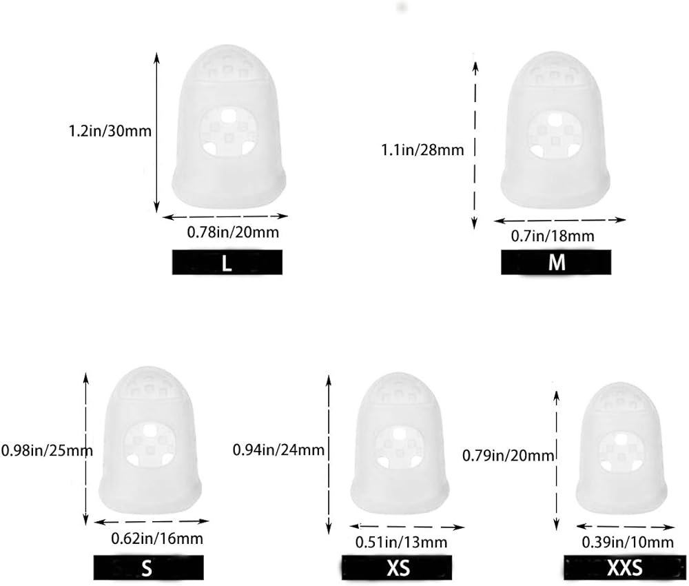【DIMENSION】The guitar finger protectors includes 5 different sizes: L, M, S, XS, XXS. One package includes 8 pieces for each size, totally 40 pieces guitar finger protectors and 10 pieces celluloid guitar picks (Random Color).