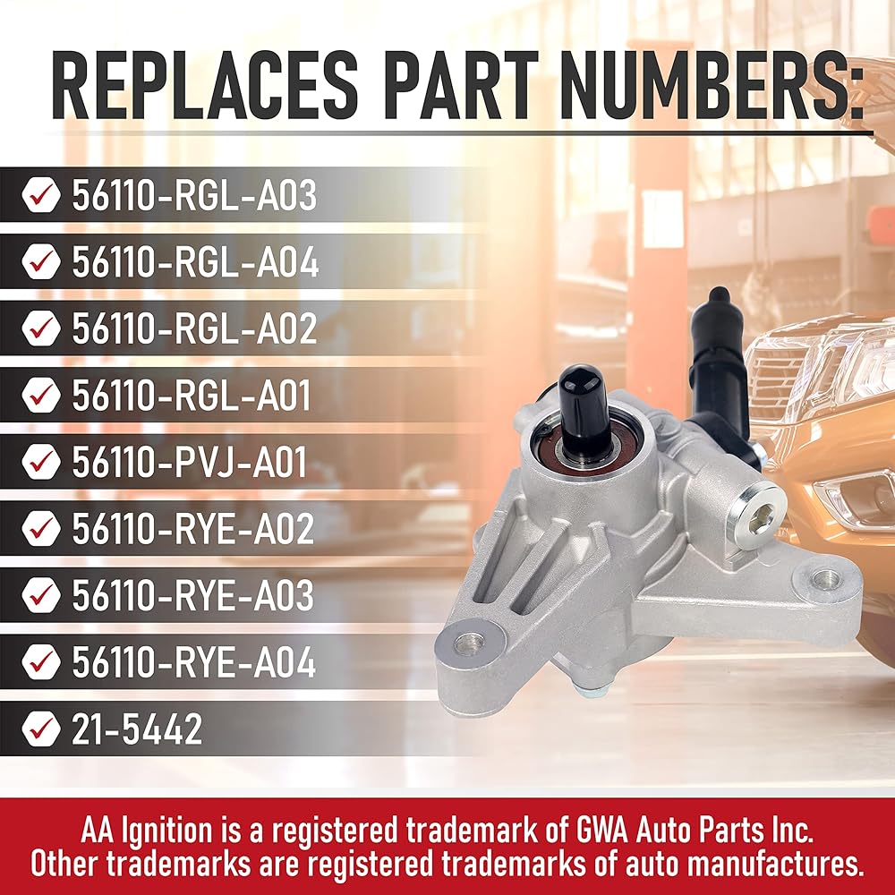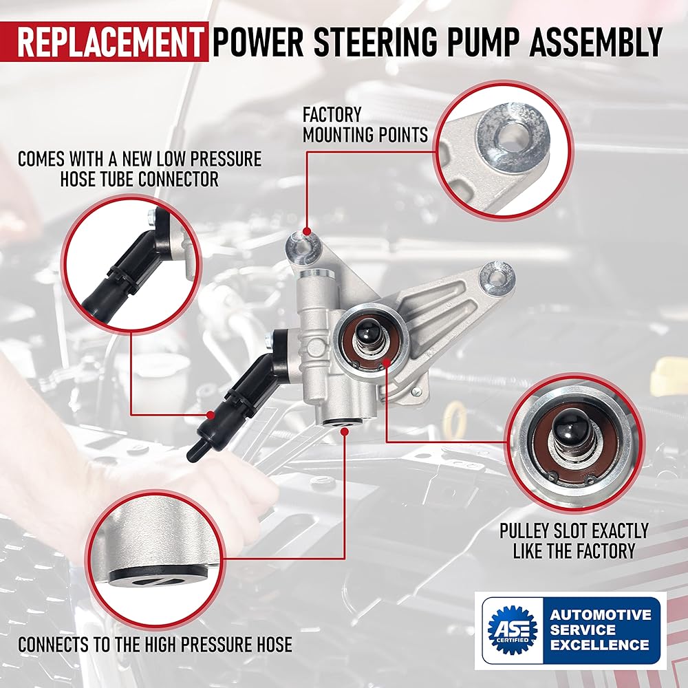Replacement Power Steering Pump with Pulley - minimizes the physical effort required in turning the steering wheel of the vehicle at various speeds. This makes driving more convenient and less fatiguing. It is unsafe to drive the vehicle if your power steering pump is broken and may also cause the serpentine belt to come off causing all sorts of problems to other accessories like the AC, Alternator and Water pump eventually damaging the engine.
