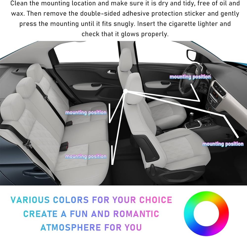 【Mounting Method】: The light comes with adhesive tape on the back. First, make sure the target area is dry and clean. Then, tear off the protective film of the double-sided tape, paste the light and press it gently. Finally, plug in the cigarette lighter. The USB style can be directly plugged into the USB port to use.