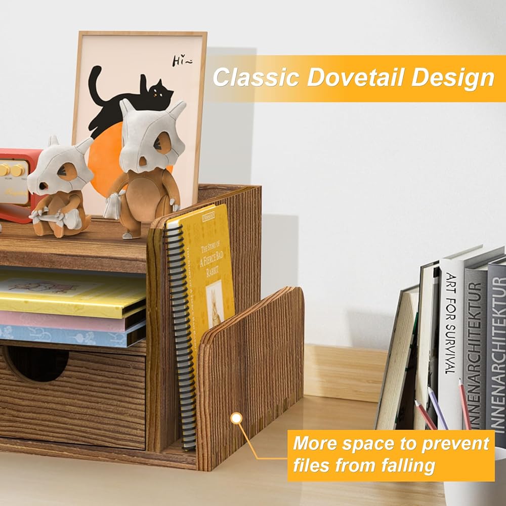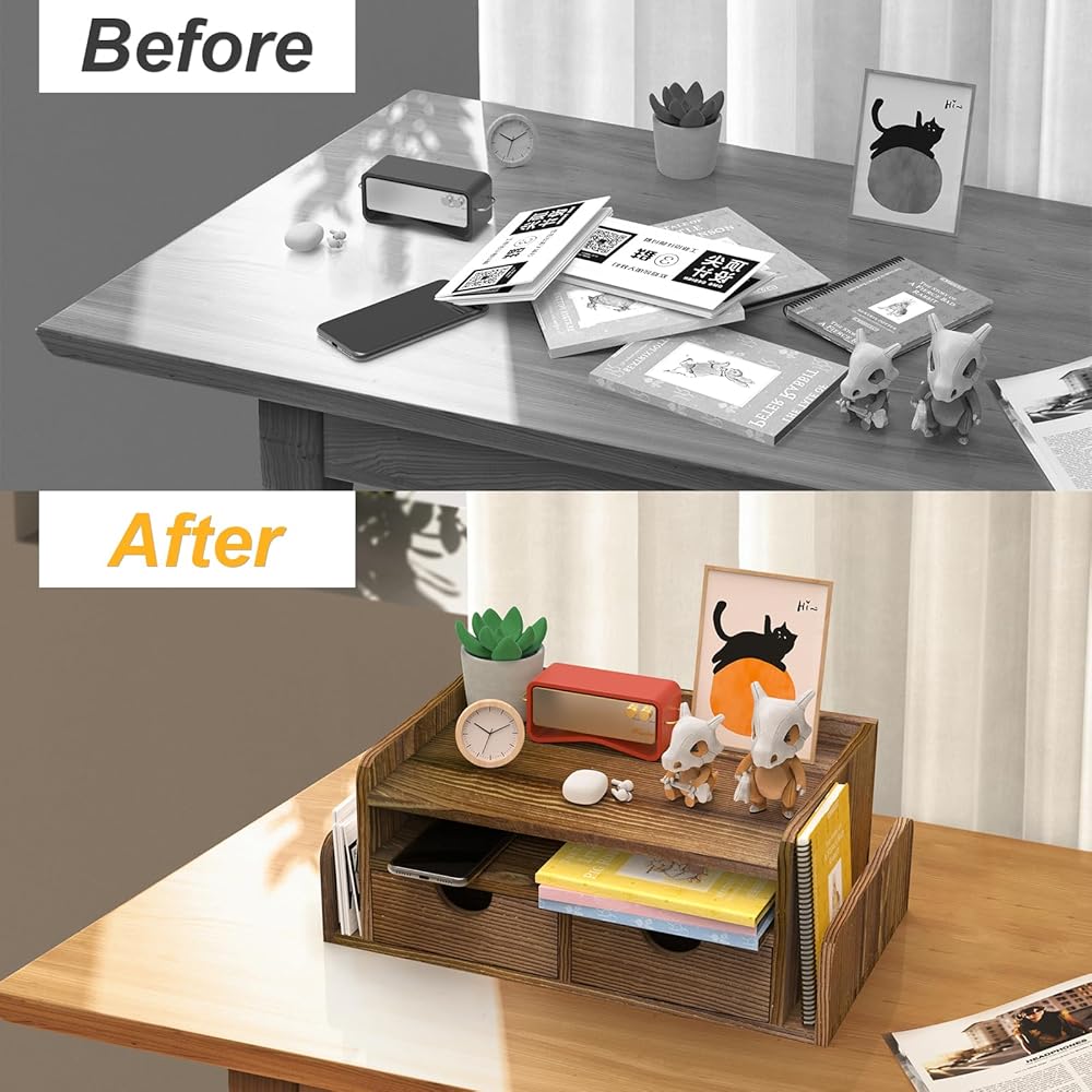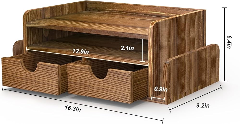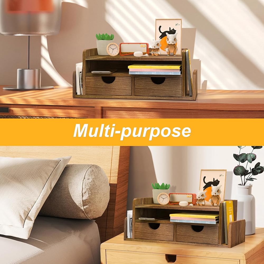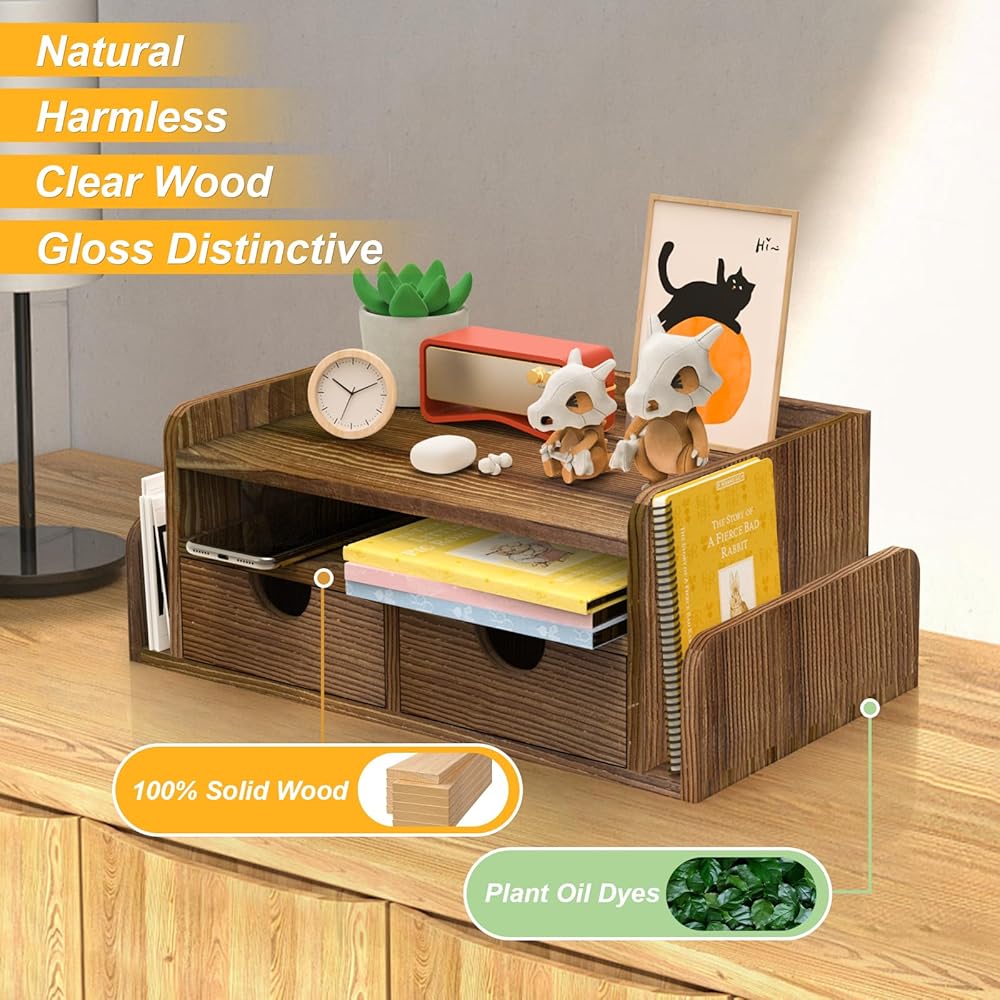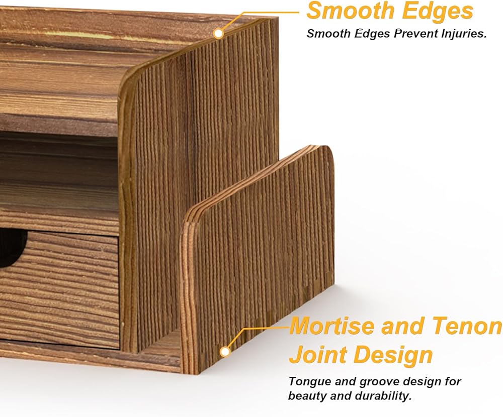 👍【VERSATILE USE】: This small desk organizer with drawers feature a rustic burnt wood design that adds a touch of natural elegance and complements a variety of decors, perfect for desktop, personal workspace use in the office, classroom, cubicle, dorm room or at home. You can customise the configuration to suit your needs.