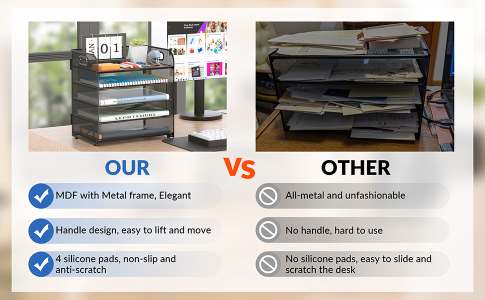✅【Sturdy MDF Tray】Our paper organizer for desk is constructed with lightweight but sturdy MDF board which is more stable and stylish than metal-mesh desk paper organizer. Stability construction with 4 RUBBER PADS to prevent it from sliding or scratching desk surface. Our desk file organizer is suitable for LETTER and A4 SIZE.