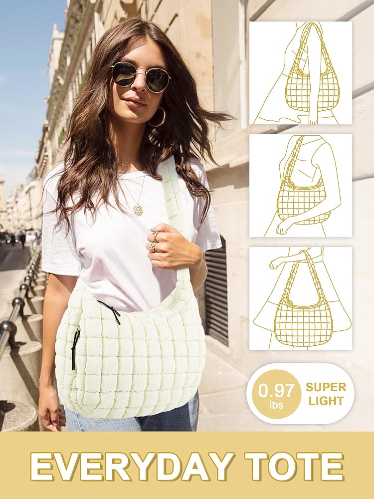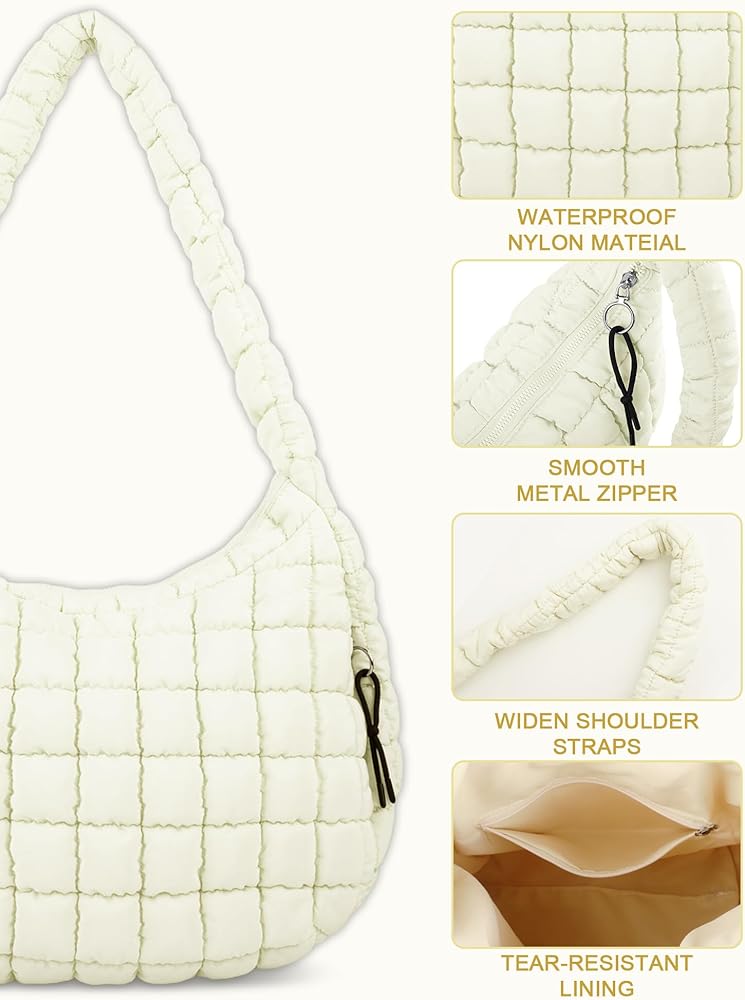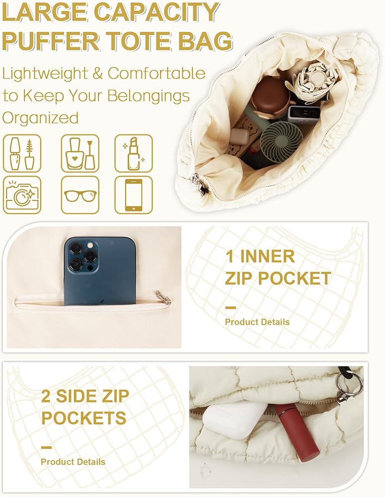 Puffer Tote Bag for Women, Large Quilted Tote Bag Puffy Crossbody Bag with Zipper, Nylon Quilted Carryall Bag Hobo Handbags