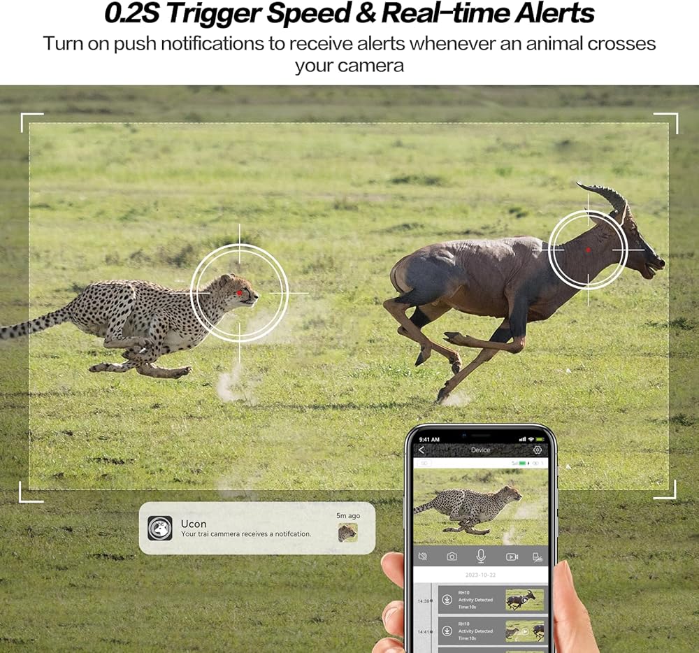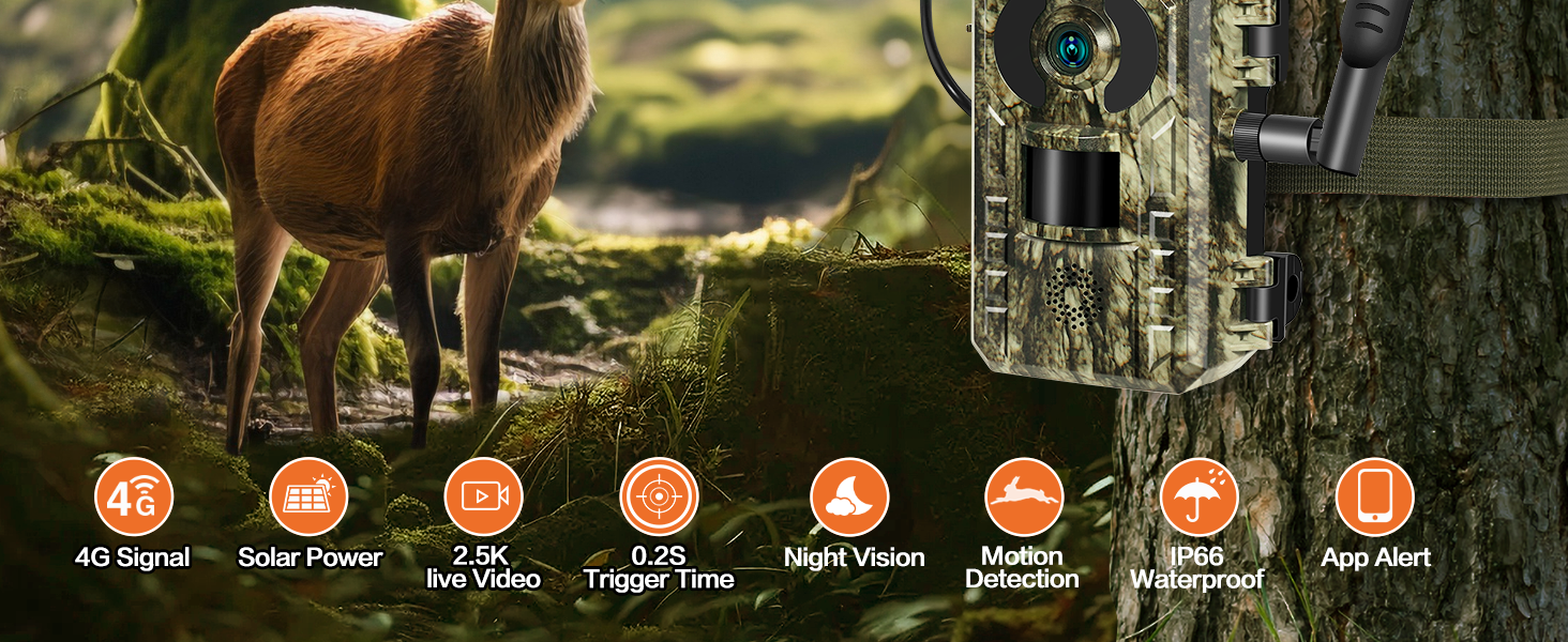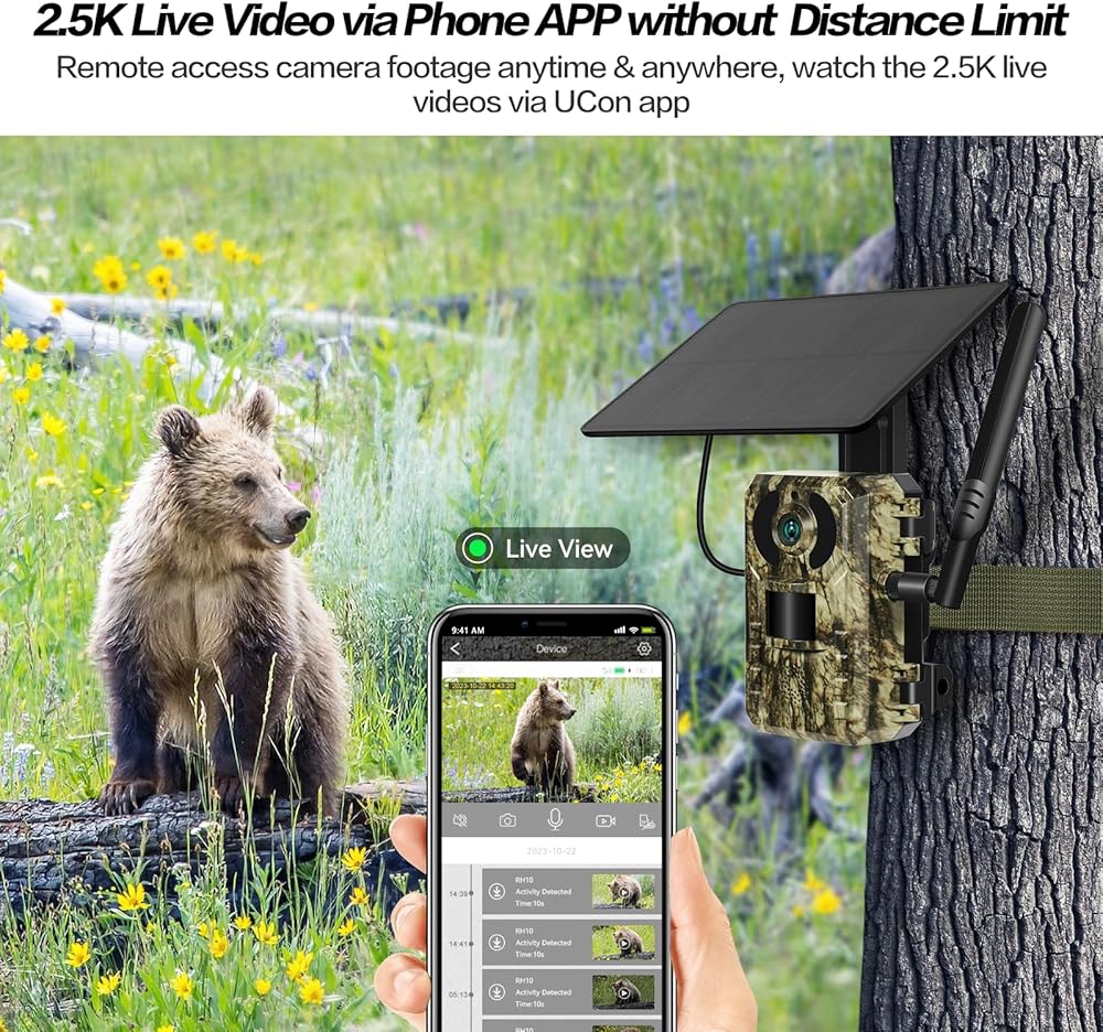 🦌2.5K Live Video & Phone Remote Access: You can easily access and control this cellular trail cameras anytime, anywhere to enjoy 2.5k real-time HD footage of deer, bears, foxes, horses and more captured by the camera with an immersive experience with the UCon App; when the camera PIR sensor captures new high definition shots, the mobile APP will have real-time notifications, trail camera sends picture to cell phone over the 4G network , and you can also share your hunting camera wirelessly with your family in real time.