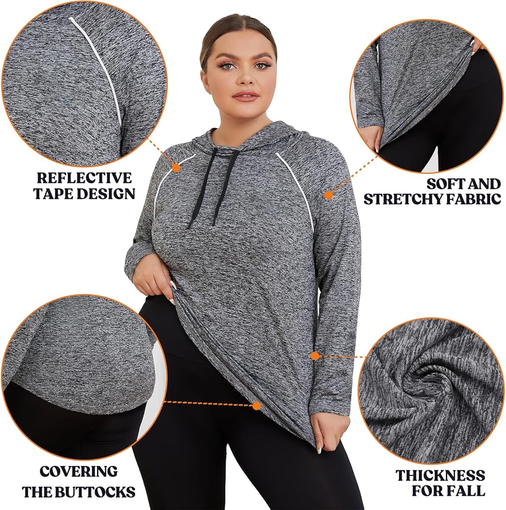 Material: 93% polyester,7% spandex, lightweight, breathable,super soft and wearable material, this plus size workout hoodies will definitely keep you cozy all day.
