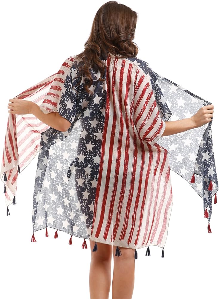 STYLE TIPS- All the beach wear converts to a kimono or scarf. This is the perfect transitional piece from day time on the beach and pool parties to a night out on the town. Specially, American Flag print's ponchos are perfect for 4th of July, Memorial Day, Veterans Day or for every national holiday. Show your patriotism! Throw over your swimsuit or pair it with a tank and jeans also, use this as scarf to accent your outfits or on a chilly night.