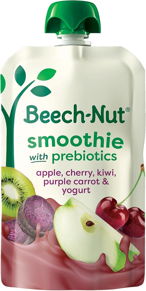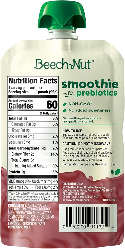 Beech-Nut Smoothies with Prebiotics are our latest tasty way to serve your toddler fruits, veggies, and prebiotics, all in the convenience of a tot-friendly pouch! Made with banana, mango, passion fruit and whole milk yogurt, these pouches contain a full serving of fruit plus prebiotics to support gut health and digestion. Beech-Nut Smoothies have no artificial colors or flavors, no added sweeteners and are non-GMO (made with ingredients that are not genetically modified). This Stage 4 pouch is ideal for toddlers 12 months and older.