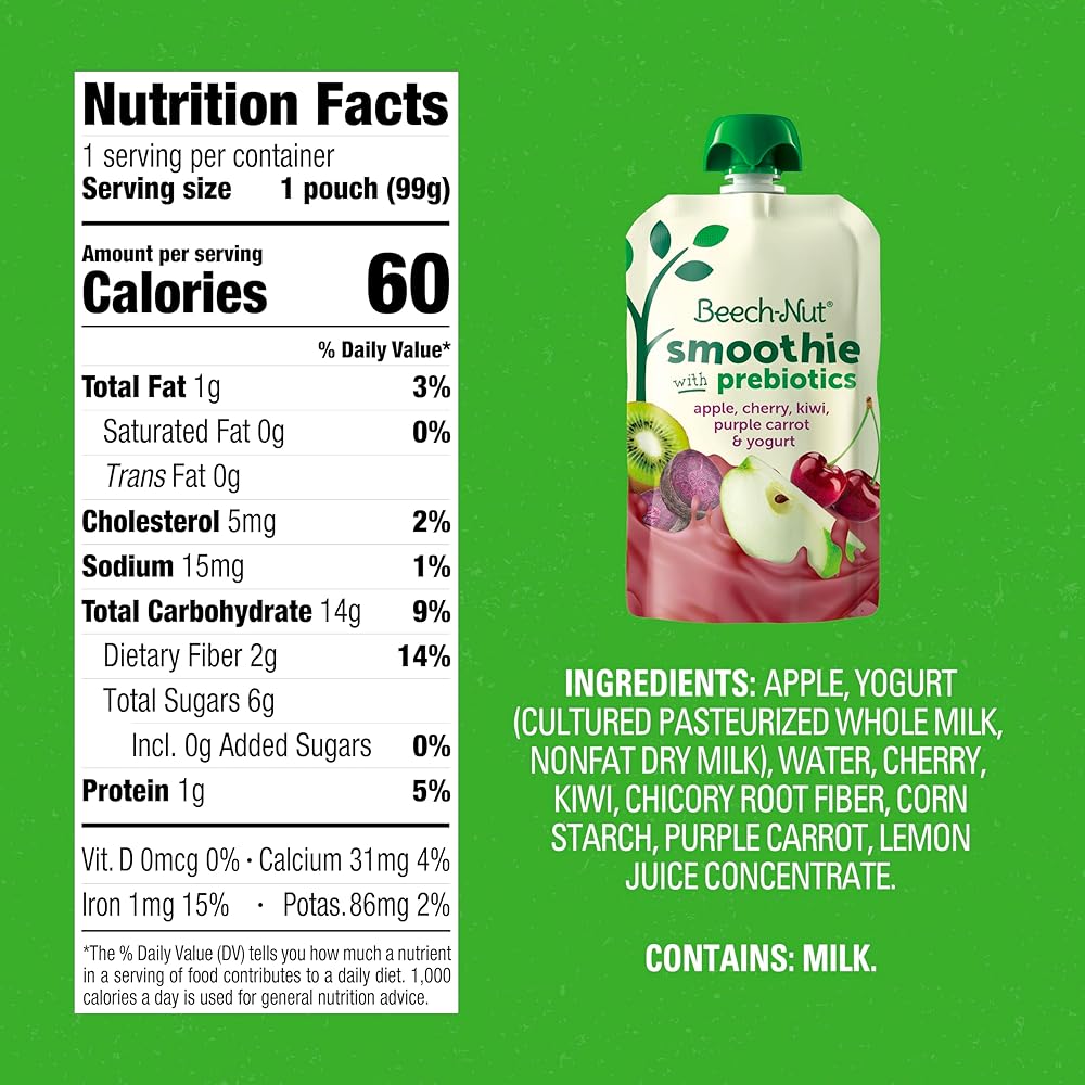 PREBIOTICS TO SUPPORT GUT HEALTH: Beech-Nut Smoothies are made with whole milk yogurt and prebiotics to help support your toddler's gut health & digestion.
