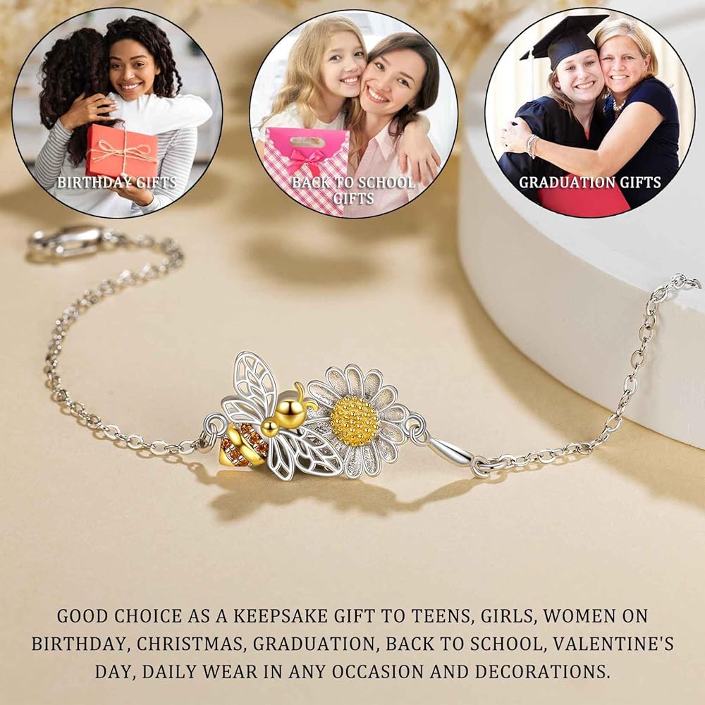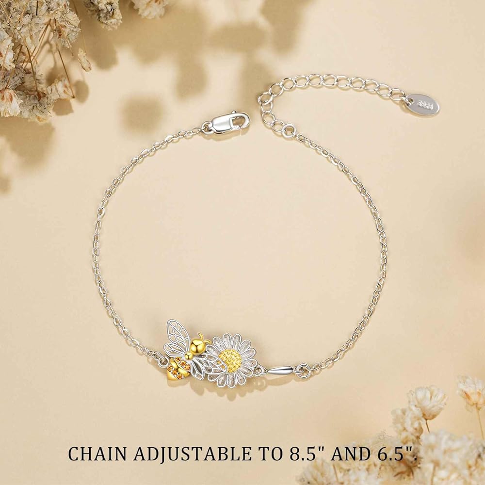 Material & Size: This charm bracelet is made of 925 sterling silver and brilliant CZ stone. The cute bee charm paired with the sweet daisy charm(bee and daisy sizes are 0.57" and 0.42") has unparalleled beauty, three-dimensionality and texture, which is absolutely eye-catching. This inspirational bracelet makes a keepsake gift.