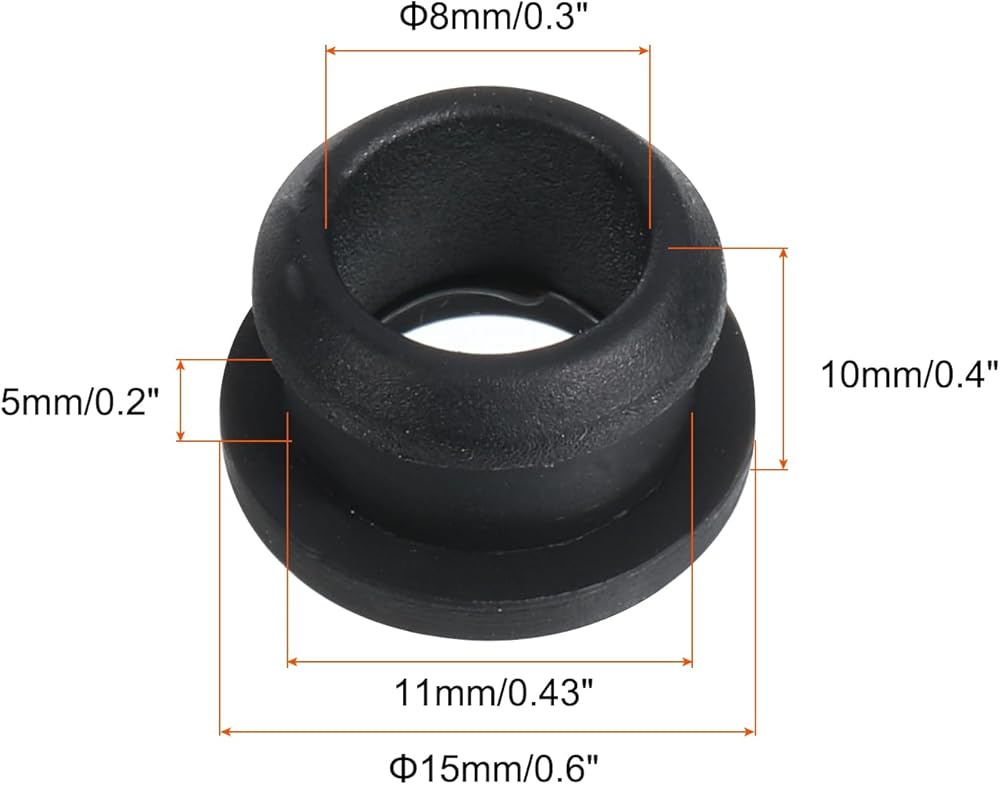 Size: 19 x 11mm/0.75 x 0.43 inch (OD x ID); Height: 12mm/0.47 inch; Mounting Hole Dia.: 15mm/0.6 inch; Groove Width: 6mm/0.24 inch; In the package of: 4 x Rubber Grommet