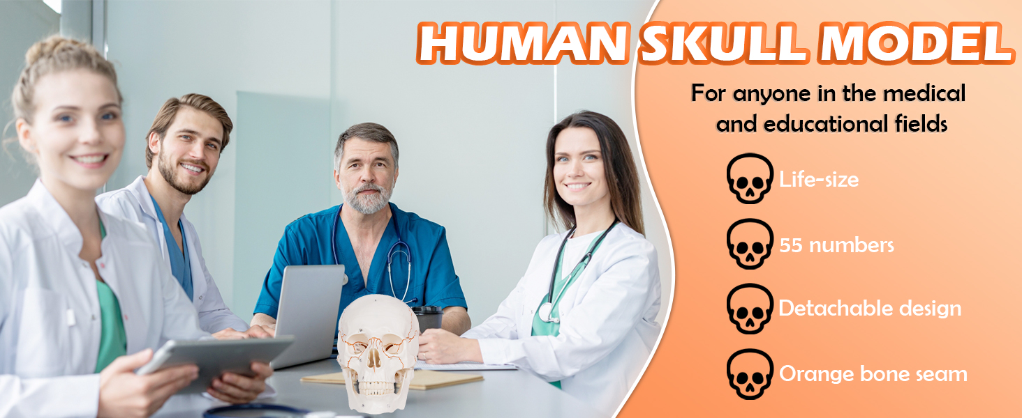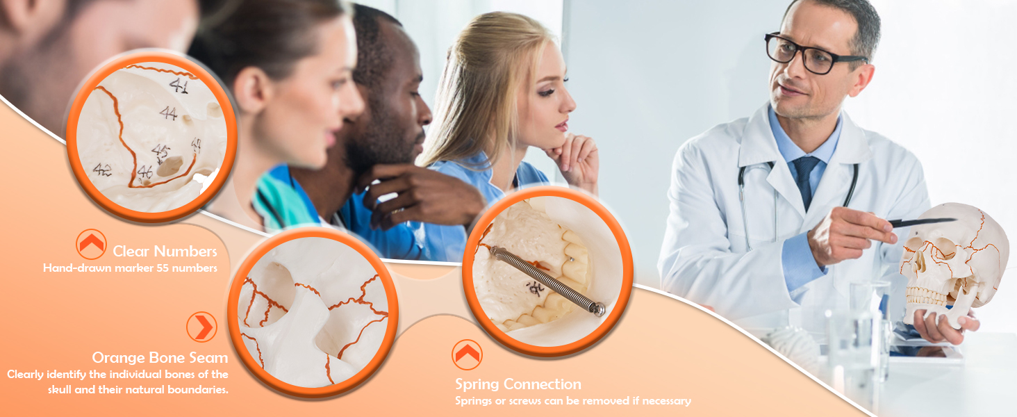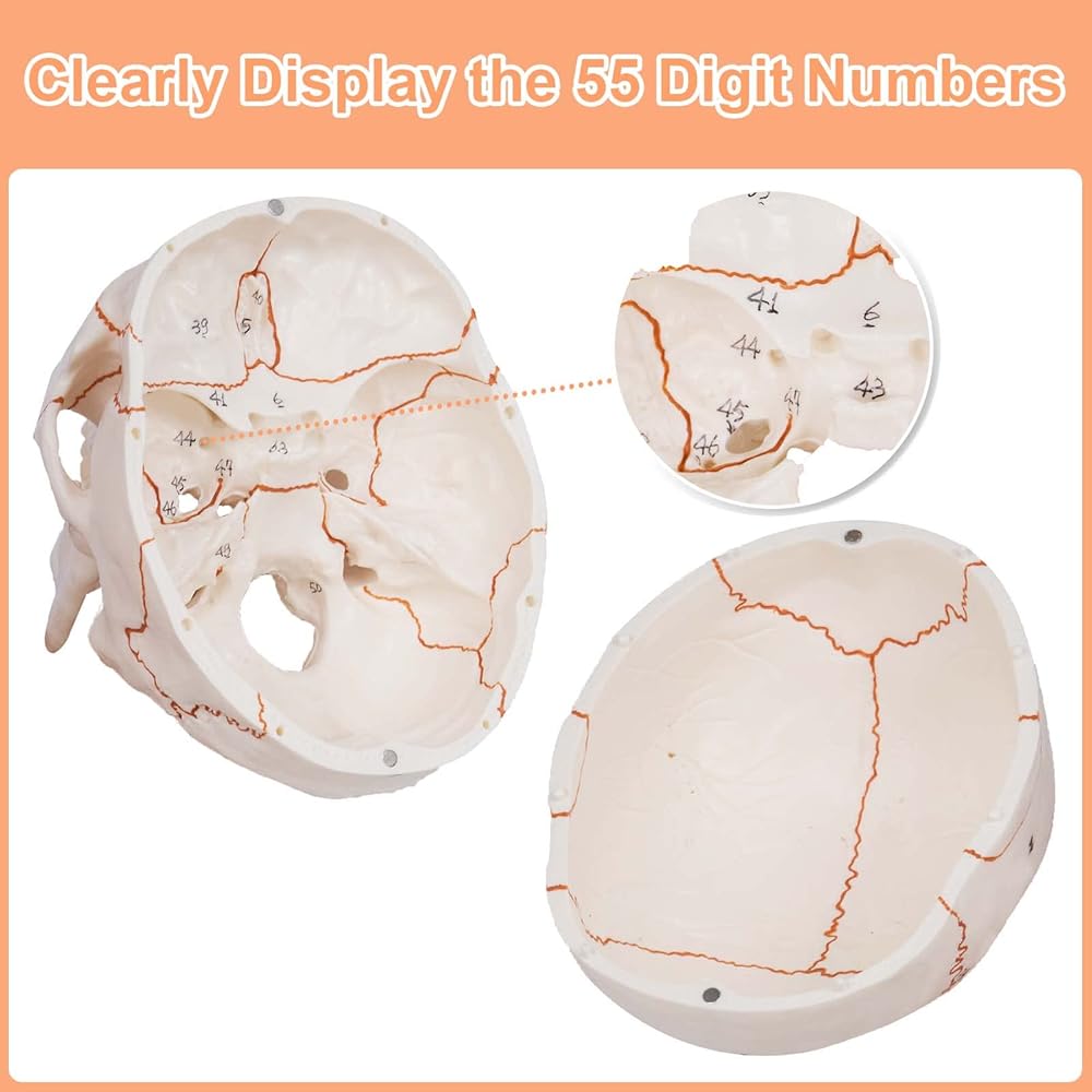 55 Medical Numbers:Our human skull model is numbered for 55 different parts of the skull and highlights the cranial sutures in orange,which will help you clearly see the interlocking bone plates and Learn about the various parts of the skull.