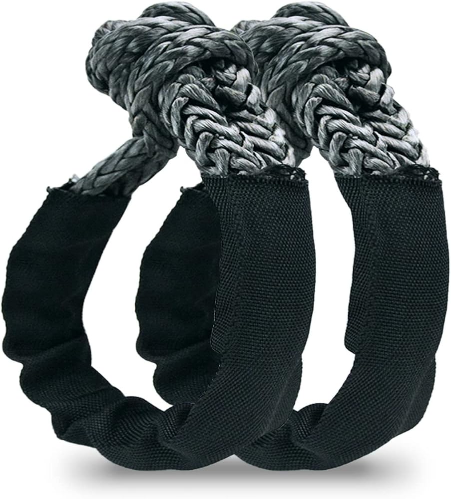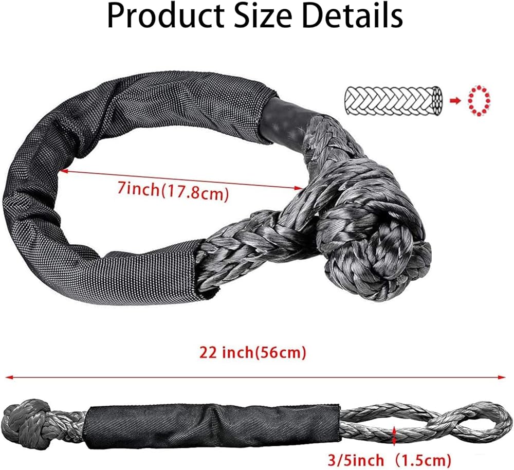 1/2 Rope Construction:Use the infinite knot design to easily take off and put on the shackle.Synthetic soft shackle rope has ultimate strength and flexibility, handling every difficult pulling points and pulling your vehicle out of ditch, mud, snow without scratching paint or damaging finish
