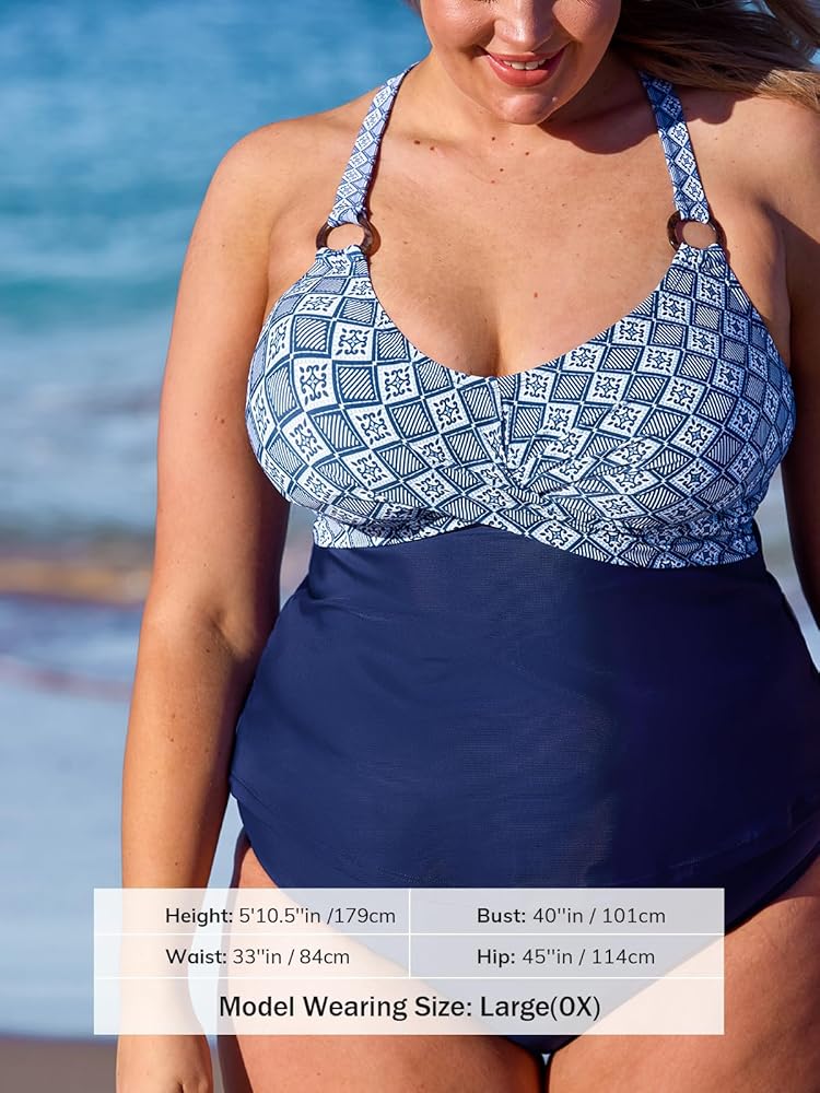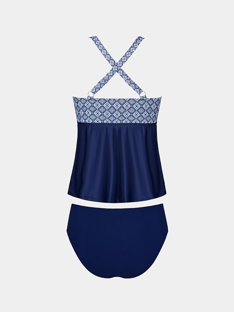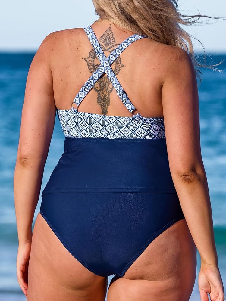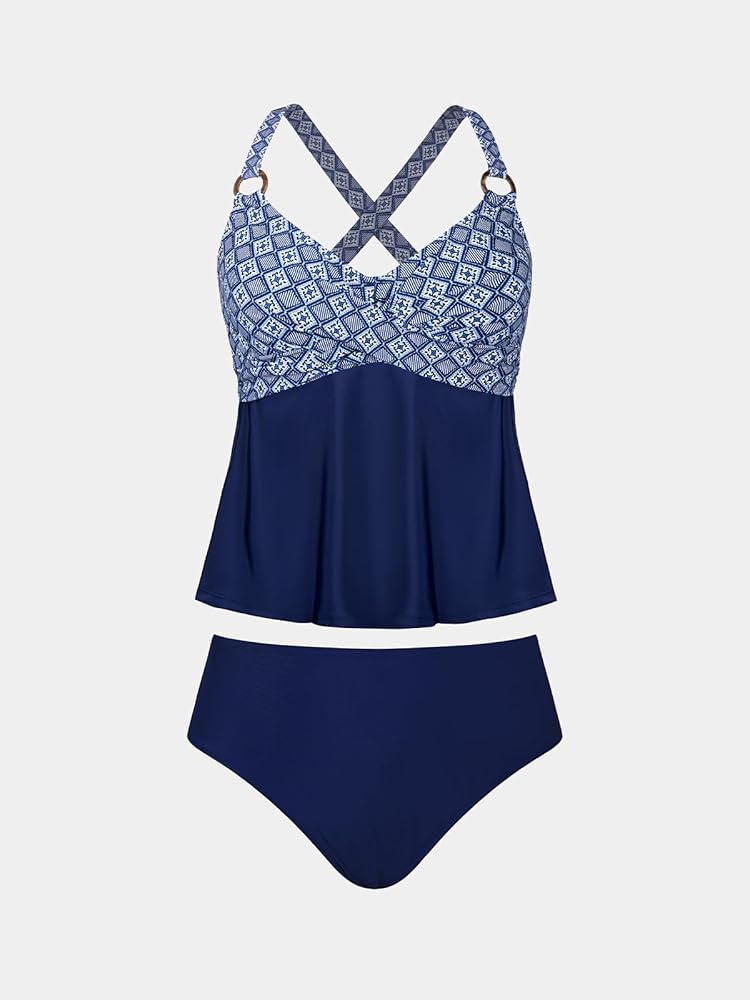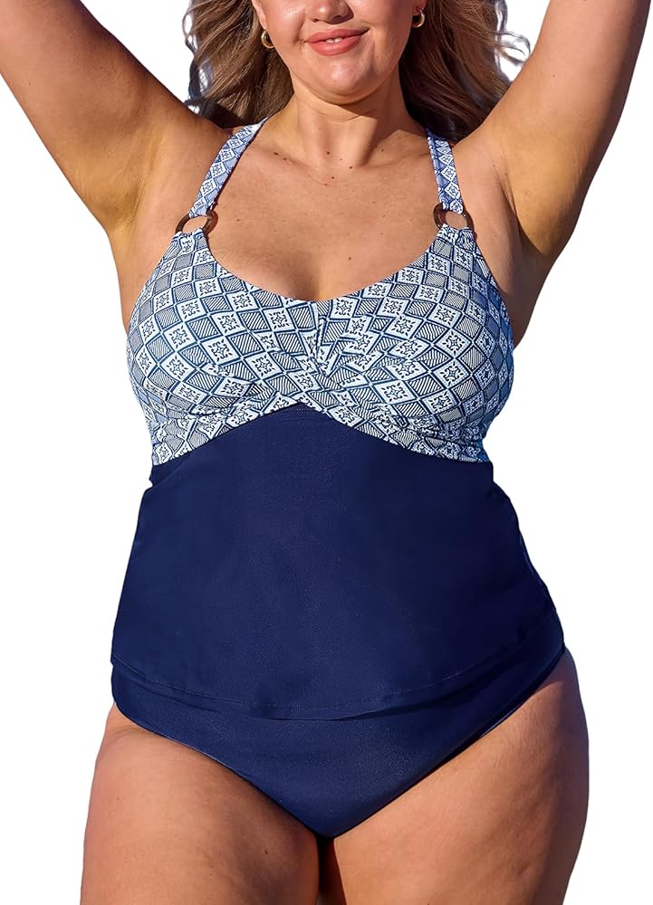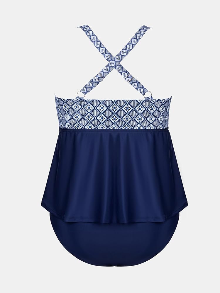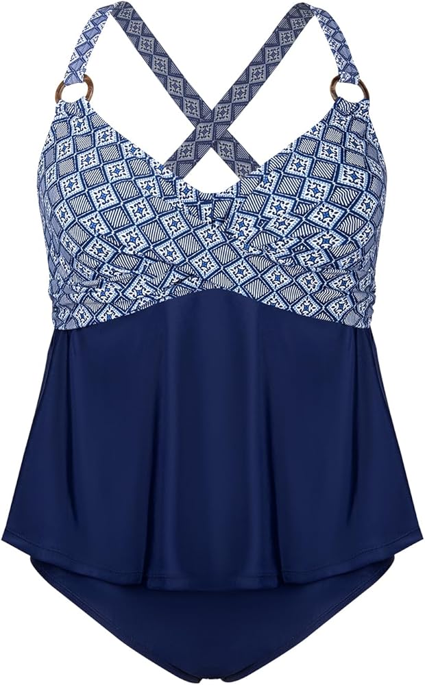 Design: Elevate Your Poolside Look with Our Plus Size Tankini Sets, featuring a V Neck and O Ring Detail. The Crisscross Back Tie Adds a Decorative Touch, while Mid Rise Bottoms and Adjustable Straps Offer a Flattering Fit. Cup: Removable Soft Cups.