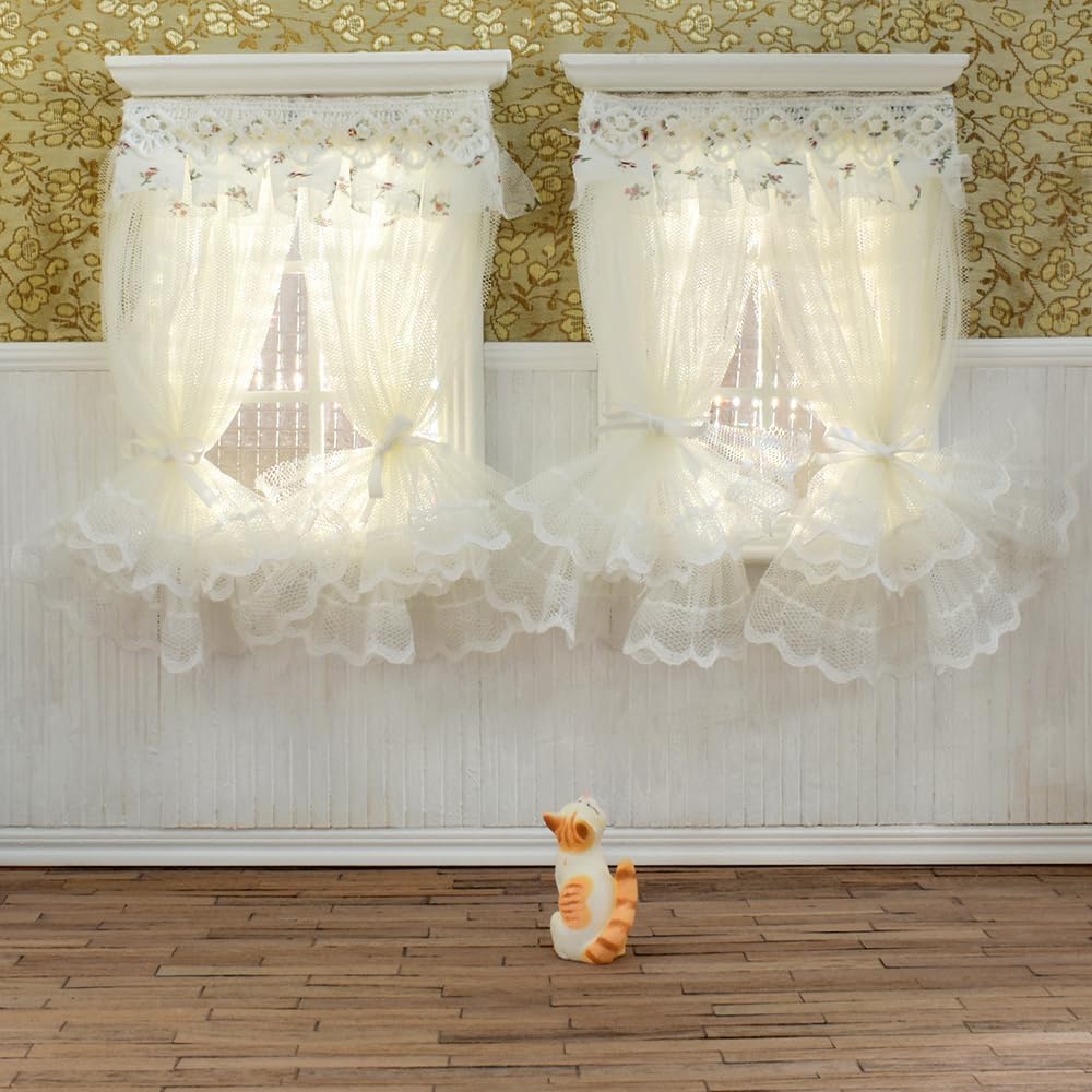 - EXQUISITE CRAFTSMANSHIP - These curtains are meticulously crafted with carefully selected lace trims, double-layered lace fabric, and dainty floral chiffon. Expert artisans skillfully sew each piece, resulting in a stunning realism that even stands out under a macro lens. When a gentle breeze flutters through the delicate lace layers, allowing sunlight to filter in, the entire dollhouse room is instantly imbued with a romantic and inviting ambiance.