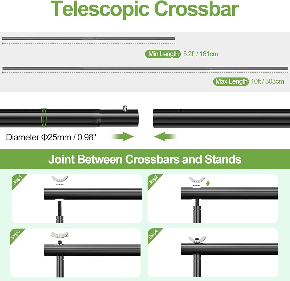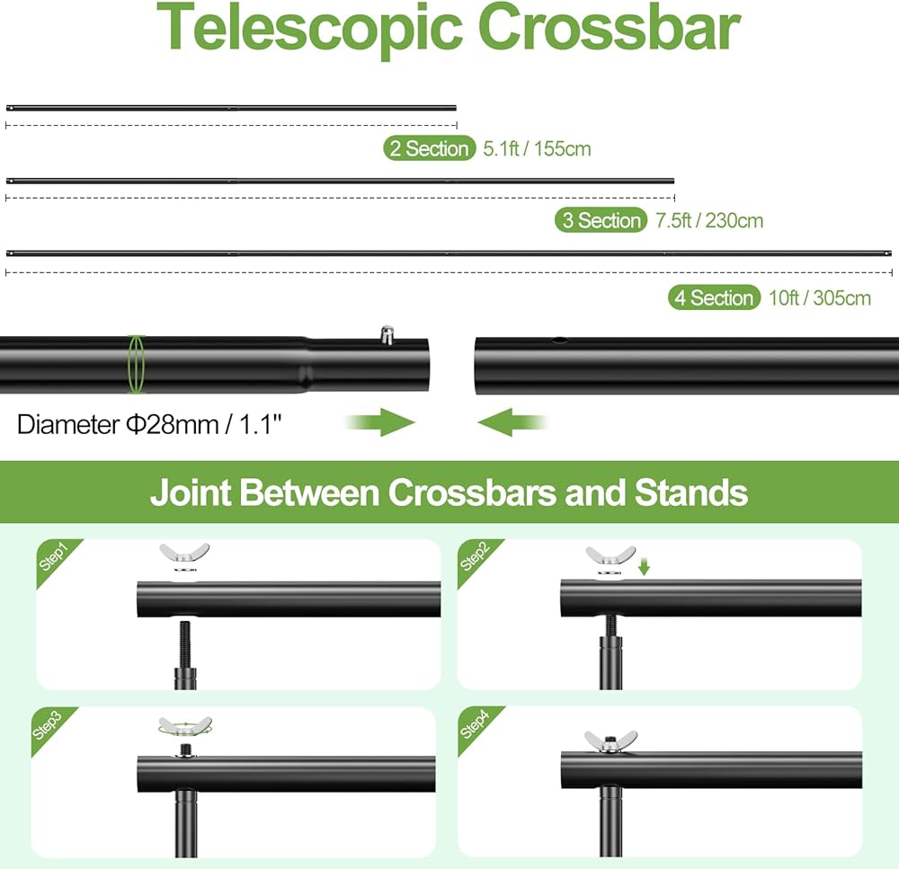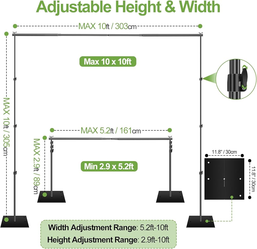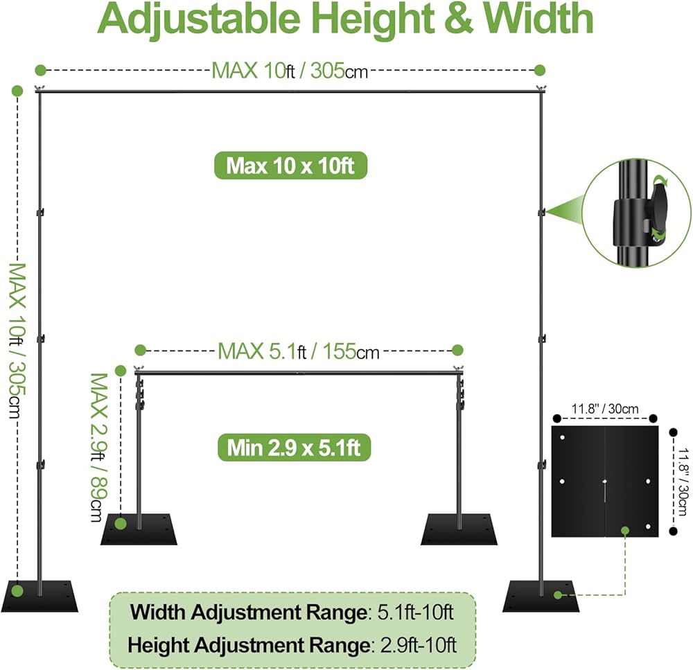 【Adjustable Height & Width】Backdrop stand adopts aluminum alloy construction, long-lasting and sturdy. Height and width adjustable with good flexibility, height can be adjusted from 2.9ft-10ft, telescopic crossbars width can be adjusted from 5.1ft to 10ft. Loading capacity up to 30lb. Easy to assemble and disassemble in just a few minutes.