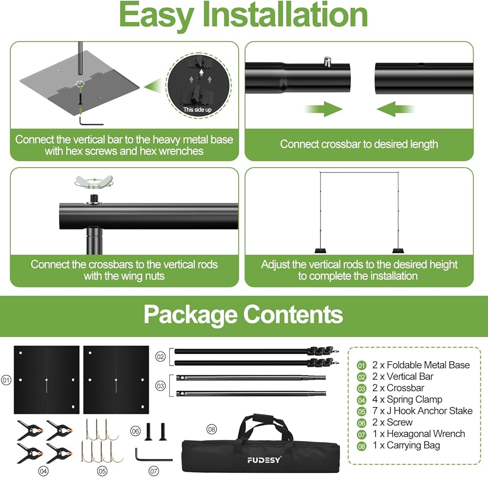 【Kit Included & Customer Service】 (2 x ) Support Sand, (2 x ) Metal Base, (4 x ) Cross Bar, (4 x ) Spring Clamps, (7 x ) J Hook Anchor Stake, (1 x ) Carrying Case / 12 Months warranty for manufacturing defects. Please feel free to contact us if you have any problems.