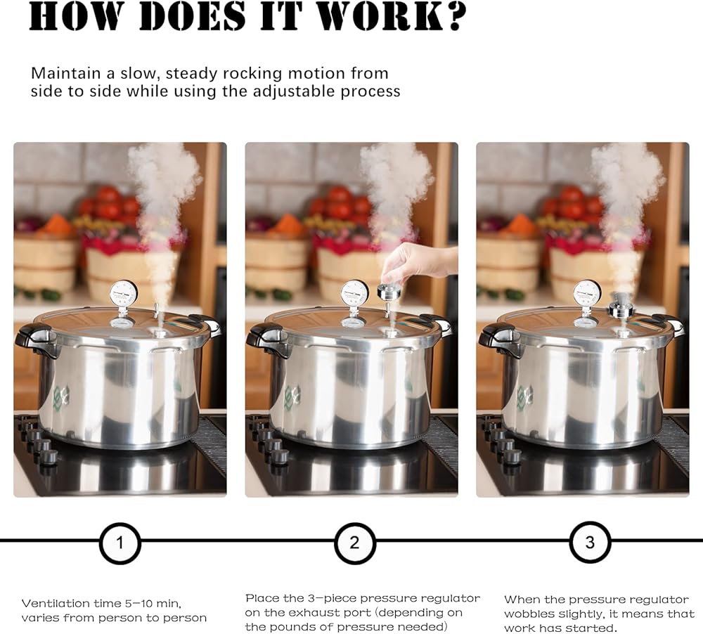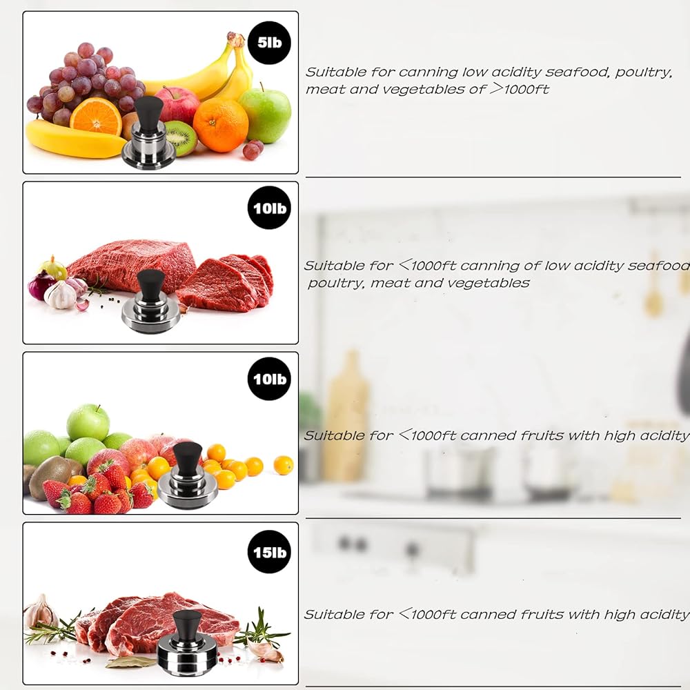 【Adjustable to make 5-10-15lb weight】It consists of the pressure regulator body and two 5-pound weight rings. For low-acid canning (vegetables, meat, poultry, seafood), use 10 pounds of pressure for altitudes up to 1,000 feet. For altitudes above 1,000 feet, use 15 pounds pressure. For high-acid canning (fruits), use 5 pounds of pressure for altitudes up to 1,000 feet. For altitudes above 1,000 feet, use 10 pounds pressure.