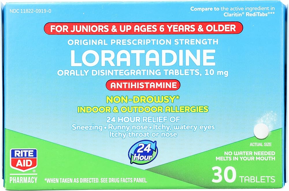 Rite Aid Loratadine 10mg Orally Disintegrating Tablets for is for Juniors ages 6 and older. Providing 24 relief of sneezing, runny nose, itchy, watery eyes, itchy throat or nose, it can be used for indoor or outdoor allergies.