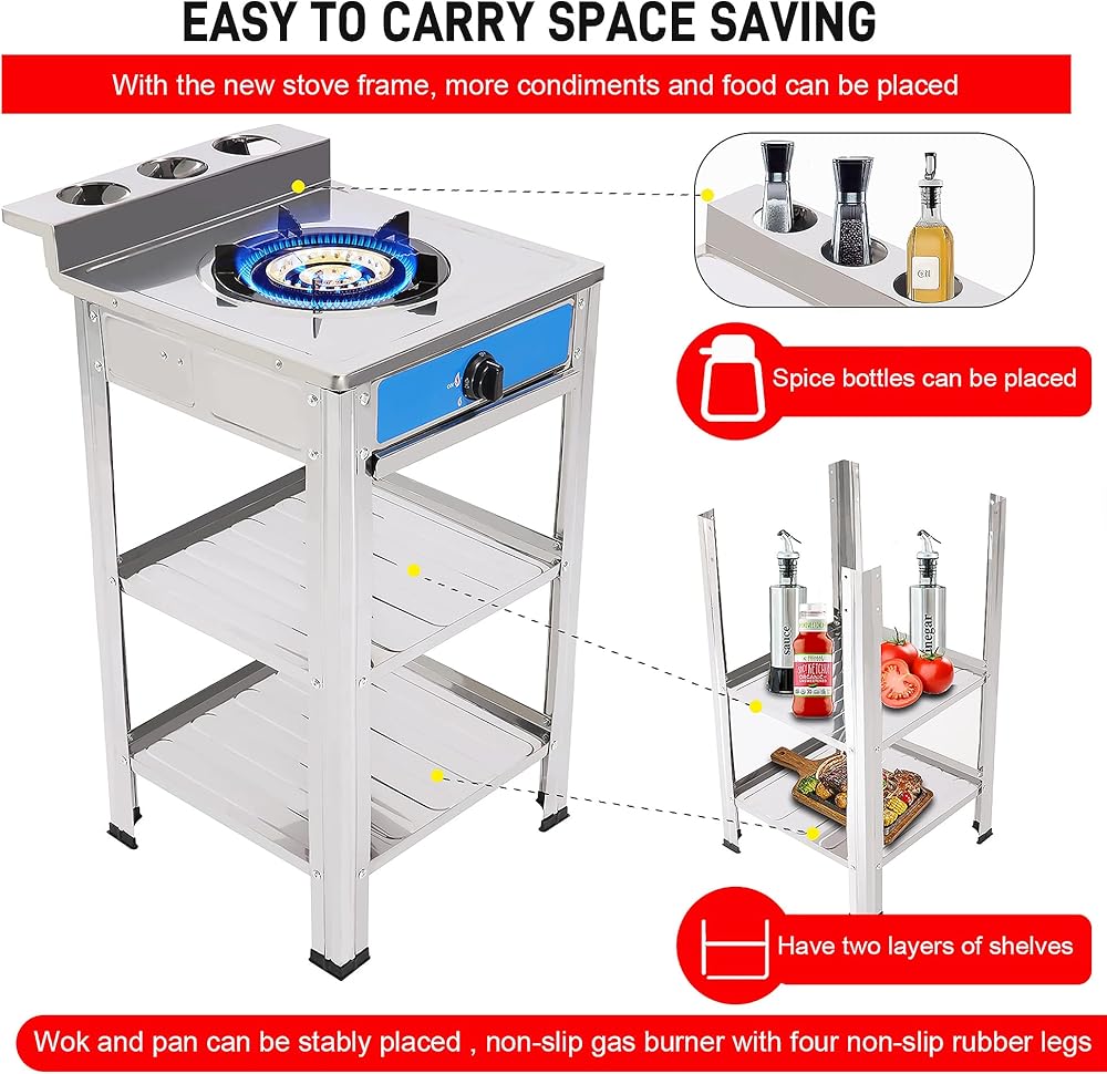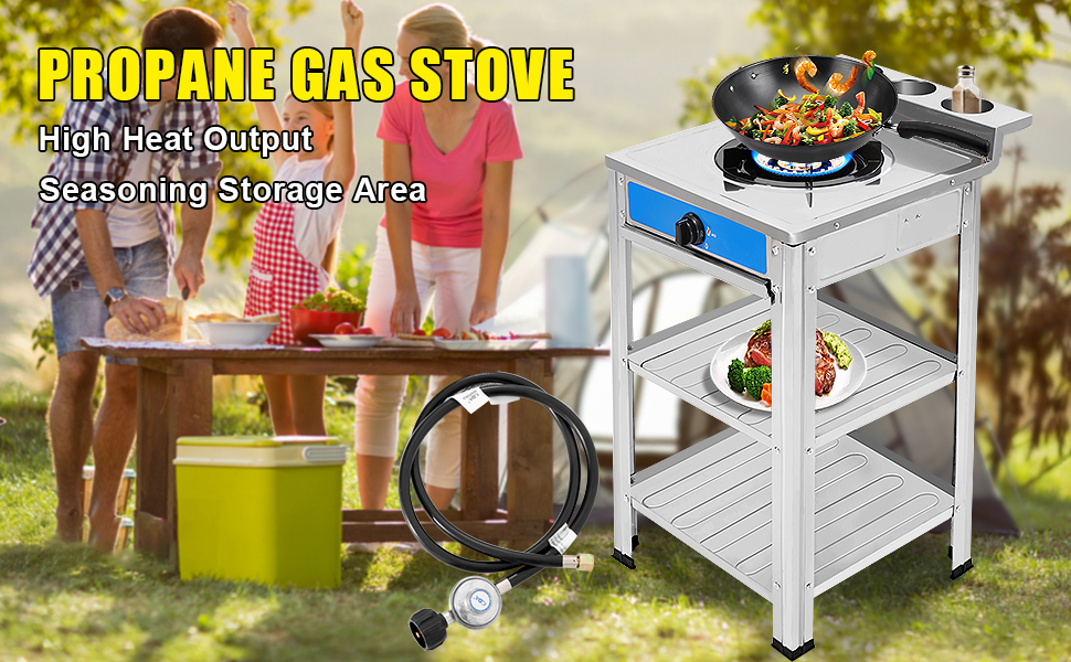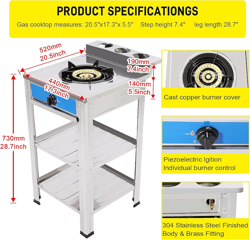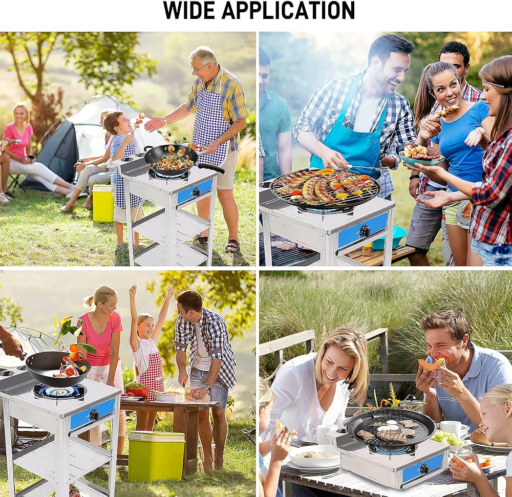 【PERFECT SIZE】-The size of this gas stove: 20.5"L x 17.5"W x 5.5"H",propane stove with detachable support leg, and stand leg height :28.7"H it is equipped with 1 burners, the frying pan and pan can be stably placed, you can invite your more relatives and friends to cook together ,The placement board can be used to place fruits, vegetables, etc.