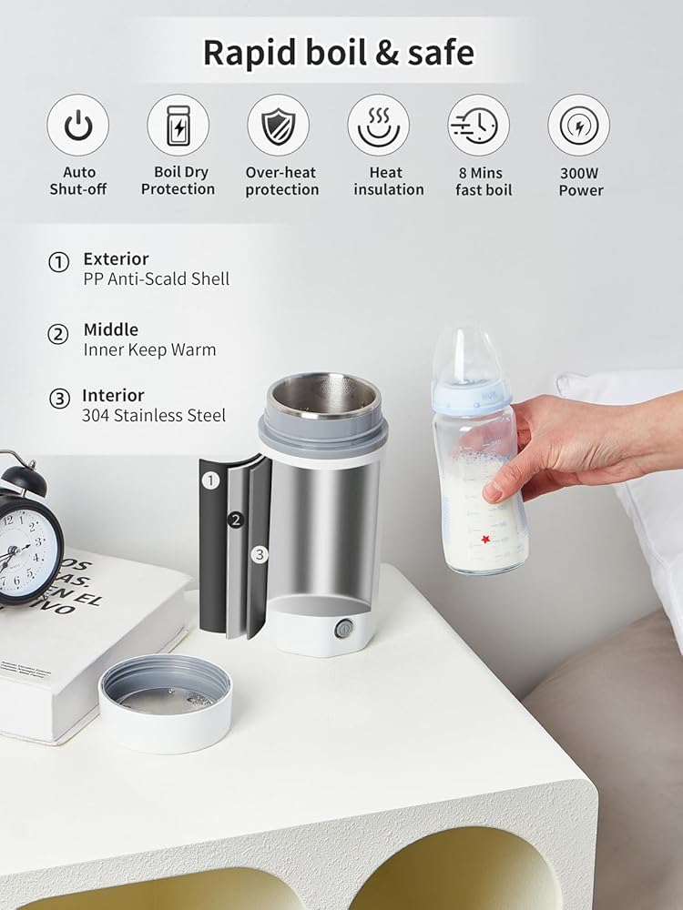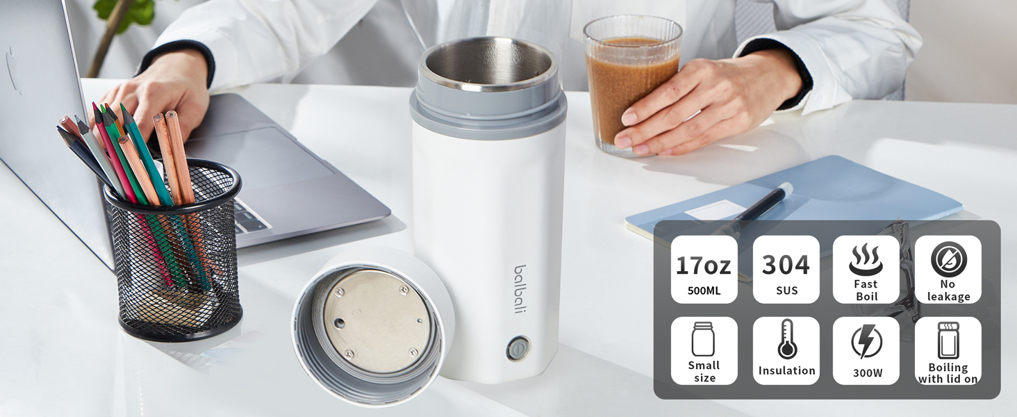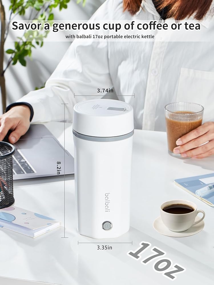 balbali 17oz Travel Kettle Portable Electric Kettle - Mini Hot Water Boiler/Maker/Heater/Warmer for Tea - Small Electric Thermos Heated Travel Mug - Portable Kettle for Travel - White