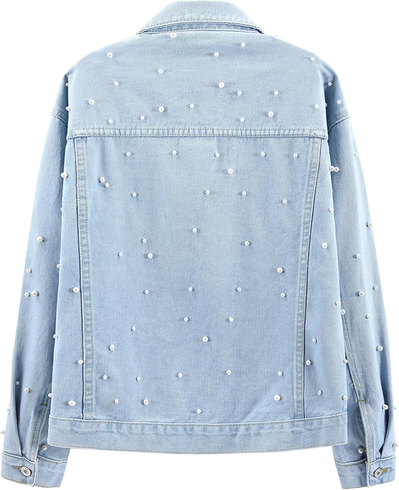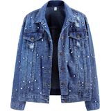 Jean jacket for women features that solid color, long sleeve, lapel, pocket, pearl design, oversized jean jacket.