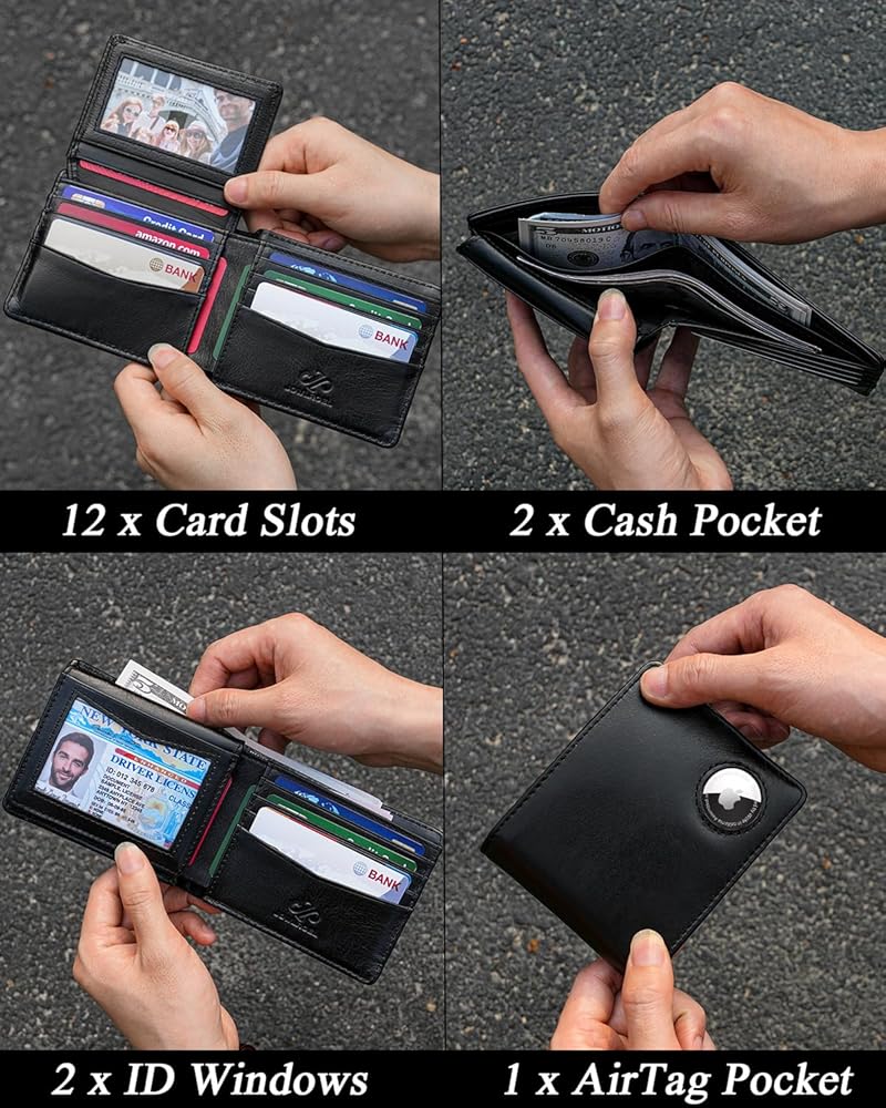 AirTag Wallet - Top Grain Leather Bifold Mens Wallet with AirTag Holder, RFID Blocking Wallet for Men with 2 ID Window 12 Card Holders and Gift Box - Black