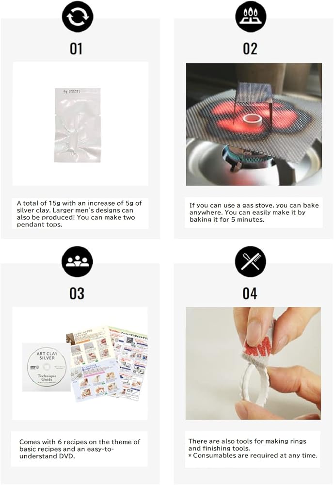Set contents : Art Clay Silver 10g x 1, Ring size scale, Town Talk silver polish cloth, Smoke liquid, 3 types of sponge abrasives (red, blue, green), Stainless brush, Medium grain grind, Polishing spatula, Tweezers , Wooden core stick (separate), Stainless steel net for gas stove firing (with auxiliary net), Production support DVD (simple package), Ring and pendant A total of 6 detailed instructions.