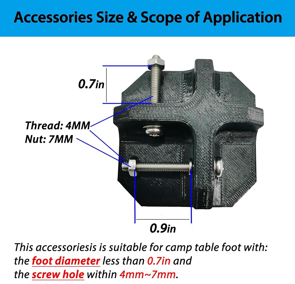 DESIGN CONCEPT: The table foot are made of high-quality plastic and paired with stainless steel screws and nuts, suitable for camping table frames with a diameter of less than 0.7 inch. The screw combination is M4, including screws, nuts, washers, which can effectively fix the table legs.