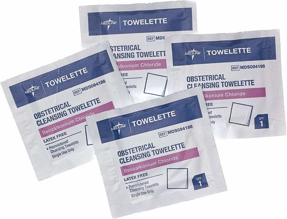 Medline Obstetrical Towelettes are essential hygiene products. Packaged conveniently in a box of 100, these towelettes are perfect for on-the-go needs. Each towelette is crafted from soft, durable material, offering gentle yet effective cleansing. They are free from harsh chemicals like alcohol, making them safe for frequent use on sensitive skin. The individual packaging of Medline's towelettes makes them an ideal choice for both personal use at home and by healthcare professionals in maternity wards. Their ease of use and disposability add to their hygienic appeal. The towelettes are imbued with mild cleansing agents that soothe the skin while ensuring thorough hygiene.