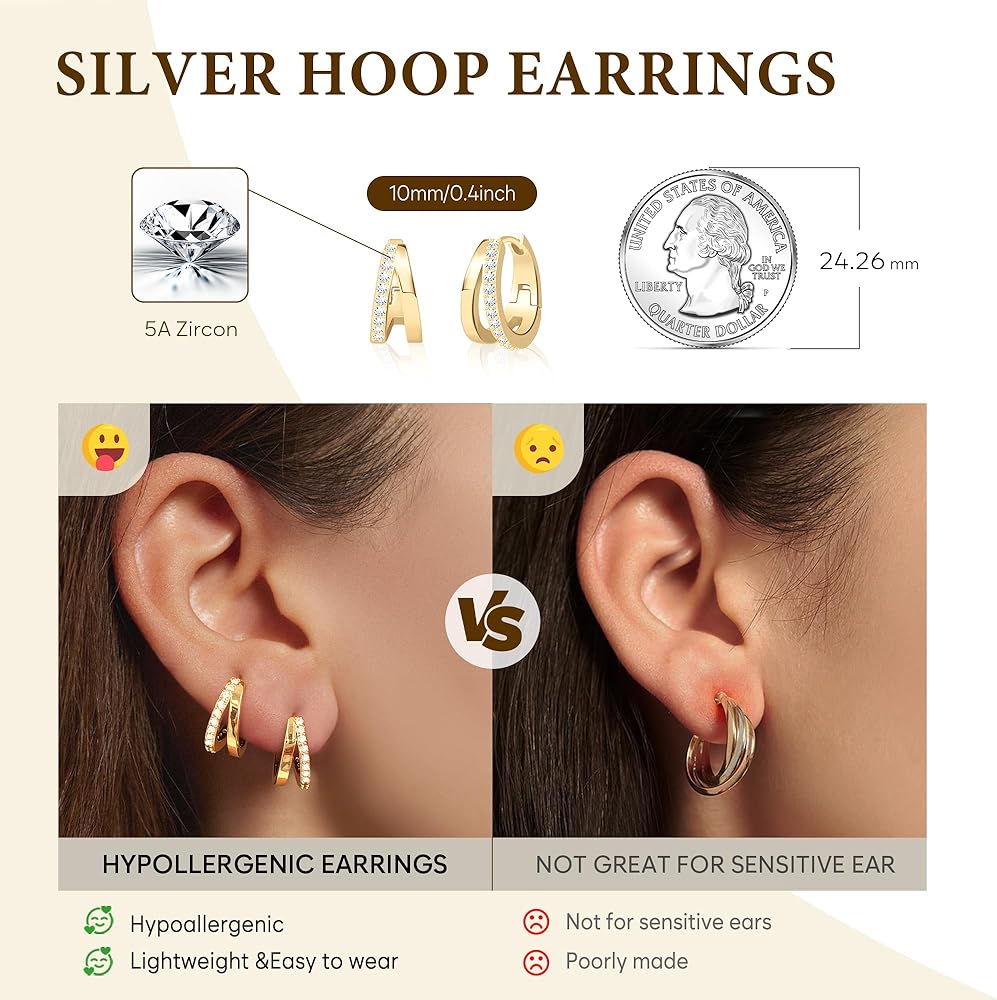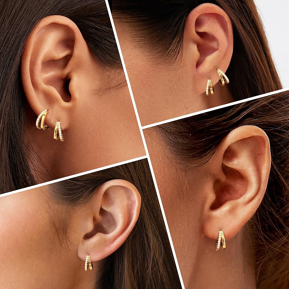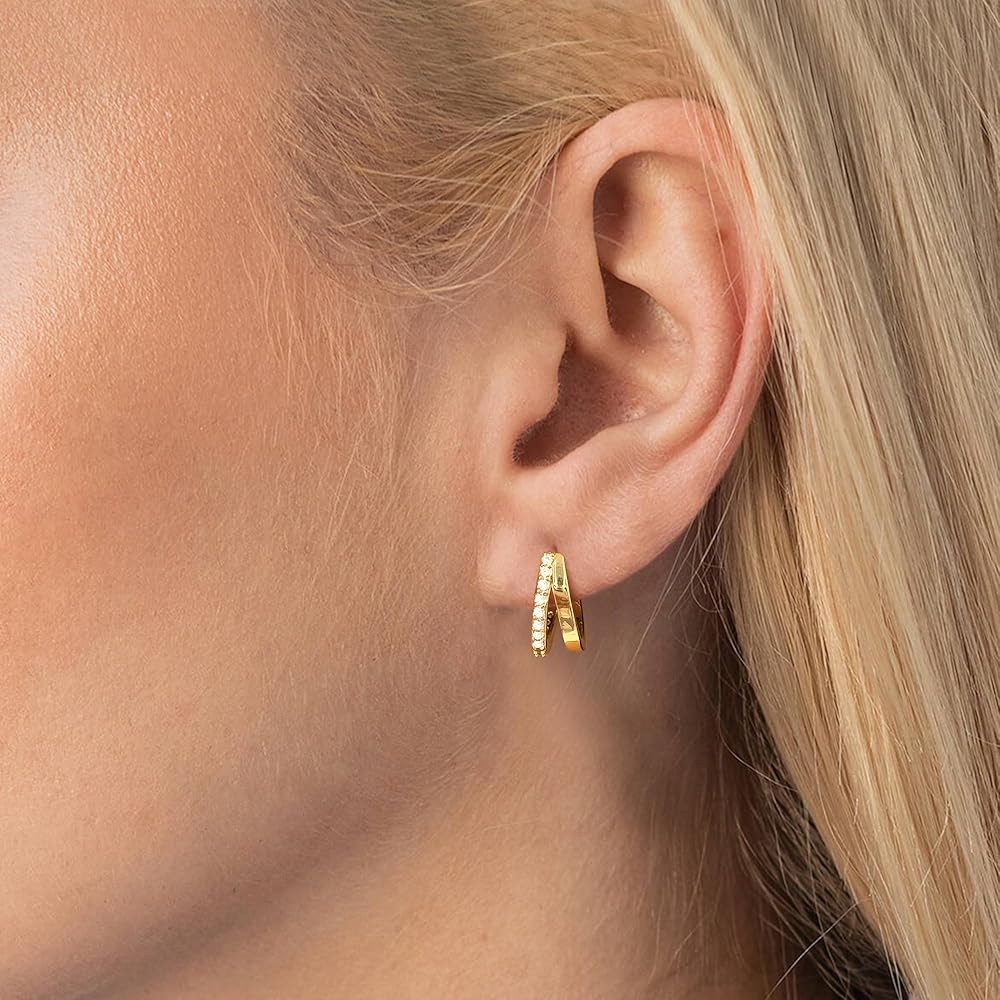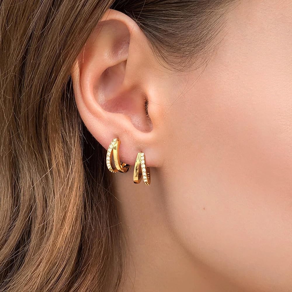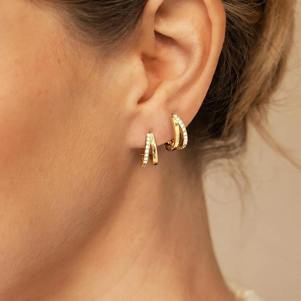 Gold Hoop Earrings for Women Trendy, 14K Gold Plated Dainty Small Huggie Double Hoop Earrings Hypoallergenic Lightweight Cubic Zirconia Gold Spiral Earrings for Women