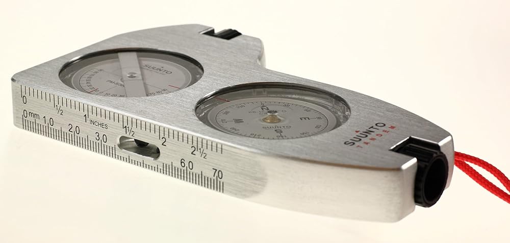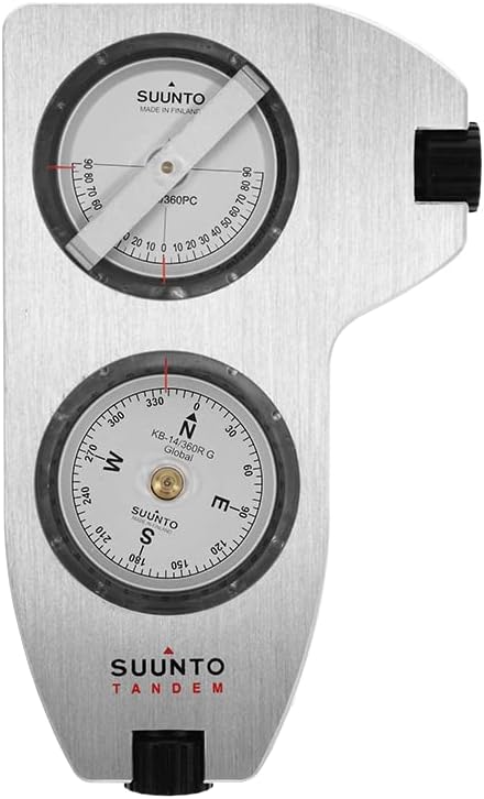 The Suunto Tandem is a liquid-filled precision compass and clinometer that's an invaluable tool for surveyors, engineers, cartographers, geologists, miners, and anyone else who needs to measure directional indications, heights, vertical angles, and slopes with speed and accuracy. The dual-purpose unit--which comes in a water- and impact-resistant aluminum housing--includes scales in both degrees (0 +/- 90 degrees) and percent (0 +/- 150 percent), along with a conversion table (cosines 0 to 45 degrees) and an optical adjustment for reading. The device is particularly handy for surveying and construction projects, as it overcomes obstacles or depressions in the line of vision. And users who need to establish GPS communication or install and position a satellite antenna will love the Tandem, as it helps in establishing the right direction and correct angle and helps ensure that nothing is blocking the satellite signal.