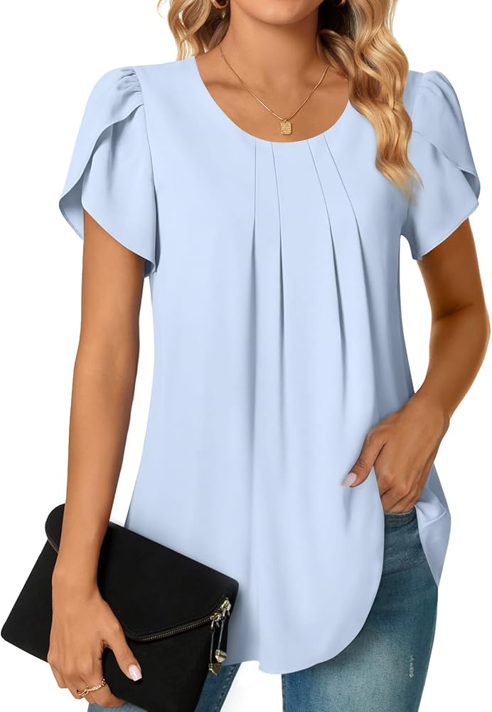 ❤【Stylish and Simple Design】: Women chiffon blouses, petal short sleeves, round neck, curved hem design, loose fit, fashionable and novel. Elegant flowy blouse, pleated front, perfect show your confidence and charming appearance.